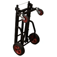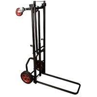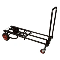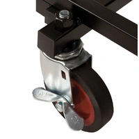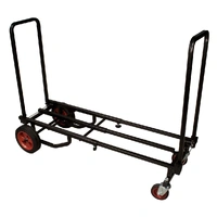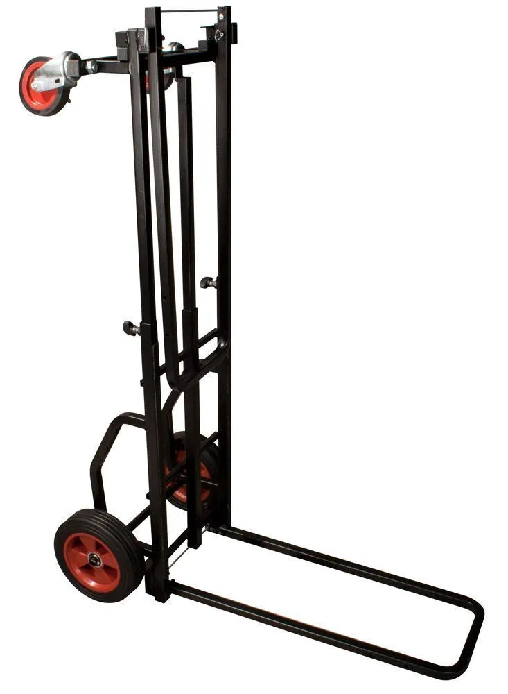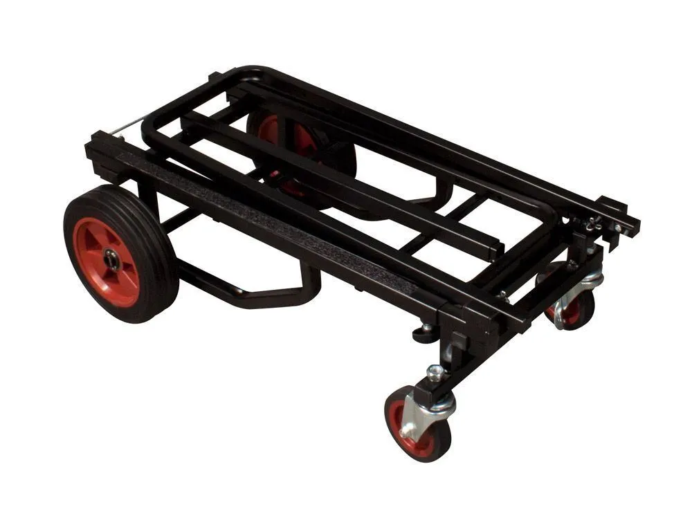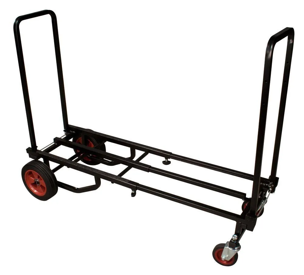The JS-KC90 Jamstand Karma Series Adjustable Professional Equipment Cart from Ultimate Support is a durable and versatile cart for carrying your sound equipment and musical instruments. With a weight capacity of 300 lb (136.1 kg), you can transport your PA system, guitars, DJ equipment, and more! The cart is constructed from strong, lightweight steel with a protective powder coating. The two larger wheels in the rear do not pivot, but the two front wheels pivot 360°. One of these front wheels has a locking caster for secure loading and unloading. Eight possible configurations give you plenty of options for using this cart to suit your needs. The Karma cart is easy to fold up for transport or storage, too. Construction Strong, light-weight steel with a protective powder coating Weight Capacity 300 lb (136.1 kg) 8 Configurations 8 possible variations: # Short Equipment Truck with both foldable sides in upright position # Short Equipment Platform with one side folded down # Short Equipment Dolly with both sides folded down # Long Equipment Truck with both sides in upright position and base extended # Long Equipment Platform with one side folded down and base extended # Long Equipment Dolly with both sides folded down and base extended # Storage and Transport Configuration with both sides folded down, base shortened and cart turned on one end # Deep Equipment Hand Truck with one side folded down and cart turned on the other end, resting on the unfolded side Foldable Sides To raise / lower foldable sides: While applying pressure to release cable with foot or hand, raise foldable side to upright position Adjustable Frame To extend frame: Loosen spring-loaded wing nuts, extend frame until it snaps into lengthened position, and tighten spring-loaded wing nuts To shorten frame: Loosen spring-loaded wing nuts, disengage position pin, adjust frame to desired shortened length, and tighten spring-loaded wing nuts To convert to deep equipment hand truck: Extend frame same way as described above, stand cart upright on large wheels and lower foldable side by pulling release cable Wheels Of the 4 wheels, the 2 in front pivot 360° while the rear 2 do not pivot. One front wheel has a locking caster for secure loading and unloading. Wheels are user-removable, though the cart is not designed for use without wheels. Replacement wheels are available