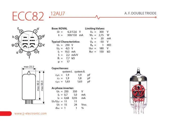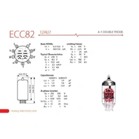 A.F. DOUBLE TRIODE - ECC82 is 12AU7 medium gain pre-amplifying double triode. Provides a very smooth sound with well-defined tones suitable for audio and guitar amplifiers.