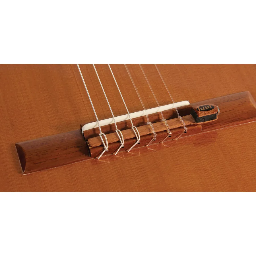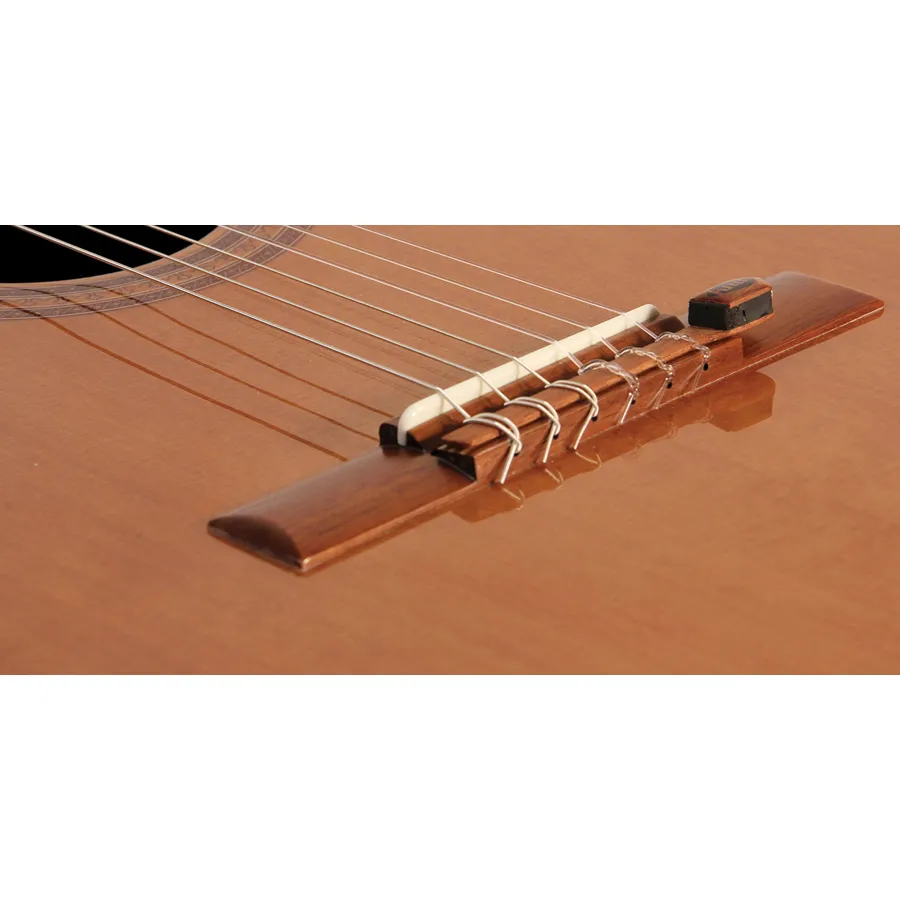 NG-1 installs safely and securely on the classical or flamenco guitar tie block utilizing the tension of the strings.