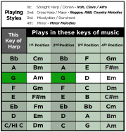 With its three altered notes, the Melody Maker™ is intended for playing Major scale melodies in 2nd Position (Cross Harp). In 1st Position (Straight Harp), you can play: Irish, Clave/Afro music. In 2nd Position (Cross Harp), you can play: R&B, Country, Reggae, Pop, Jazz, Latin.