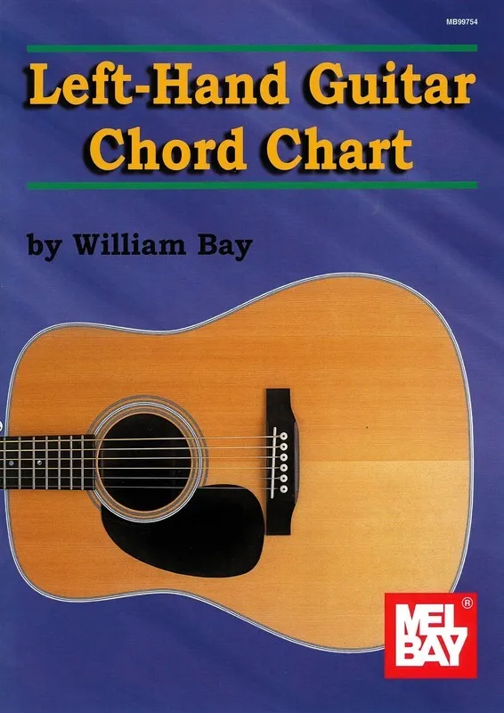 A handy chord reference guide showing basic major and minor chords in all keys. Relative and secondary minor chord relationships shown on principal chords. All forms are fingered for the left-handed guitarist. Also shown is a guitar fingerboard with all the corresponding notes on a guitar strung for a left-handed performer.