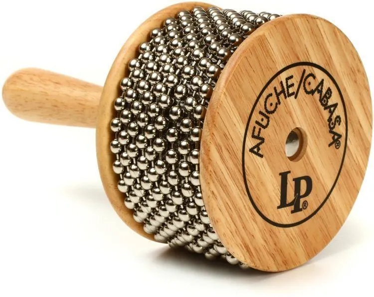 The LP cabasa uses endless loops of steel bead chain that are wrapped around a stainless steel cylinder.