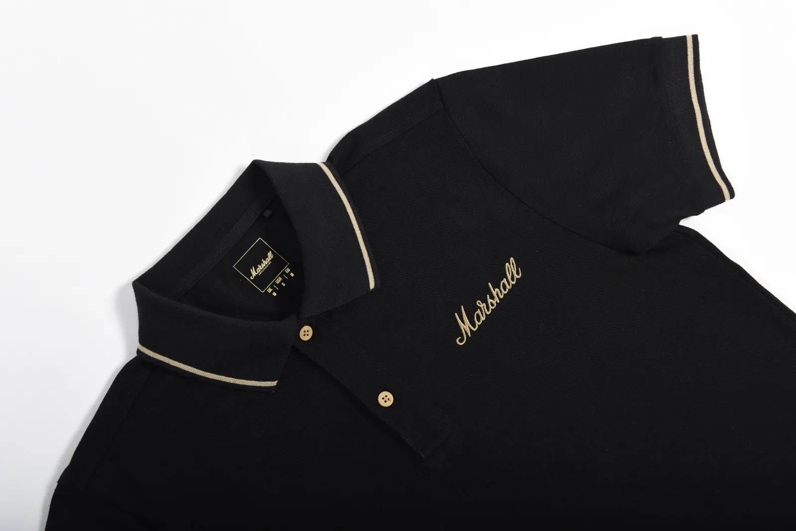 Gold embroidered script logo. Classic sizing. Gold collar and arm cuff detailing. Embroidered 60th badge on back neck. Bespoke Marshall buttons