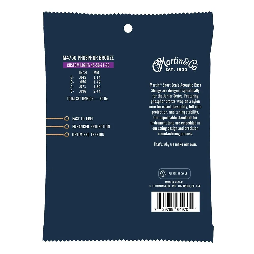 Martin® Short Scale Acoustic Bass Strings are designed specifically for the Junior Series. Featuring phosphor bronze wrap on a nylon core for eased playability, full note projection, and tuning stability. their impeccable standards for instrument tone are embedded in their string design and precision manufacturing process. That’s why they make their own.