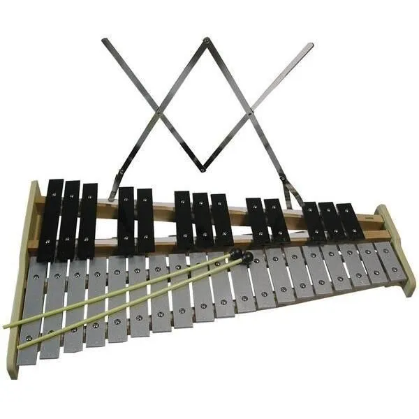 Chromatic Glockenspiel. Sturdy plastic frame construction - 32 notes F2 - C5. Natural keys = Silver, Sharps/Flats = Black. Complete with Beaters and sheet music rack.