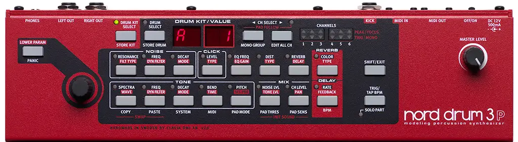 The super compact new Nord Drum 3P combines stunning playability with unlimited sound design possibilities! New features include integrated multi-pad, Reverb and Delay effects, a simplified sound selection mode and new Sound Banks for quickly creating custom kits on the fly. The ultra compact new Nord Drum 3P features an integrated super responsive multipad and external kick input and weighs under 2 kg (4,1 lbs)! The great sounding global Stereo Reverb and Delay effects lets you add a whole new dimension to your drum sounds and the effect amount is easily adjusted for each drum channel.