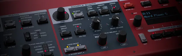 The Sample Synth Section is based on an entirely new format and contains a wide range of entirely new sounds, such as solo wind, solo brass, solo strings, basses, guitars plus a vast collection of classic analog leads and basses. Included is also a selection of samples from the Symphobia and Swing! libraries by ProjectSAM. All sounds can be quickly replaced using the Nord Sound Manager . You can also create your own sample instruments using the unique free Nord Sample Editor software for Mac and Windows.