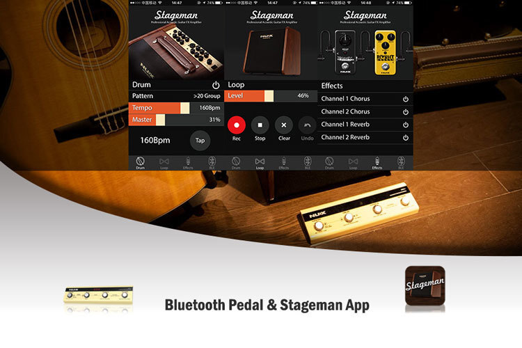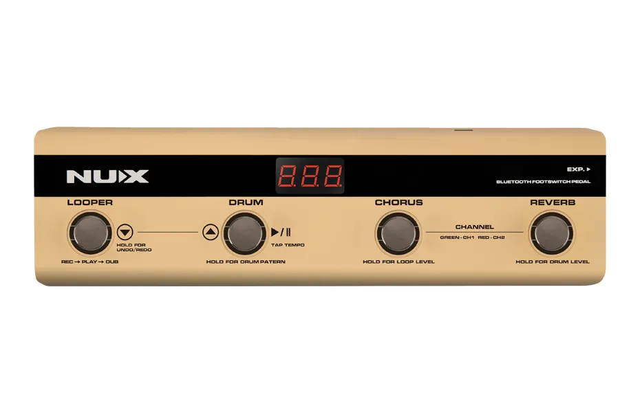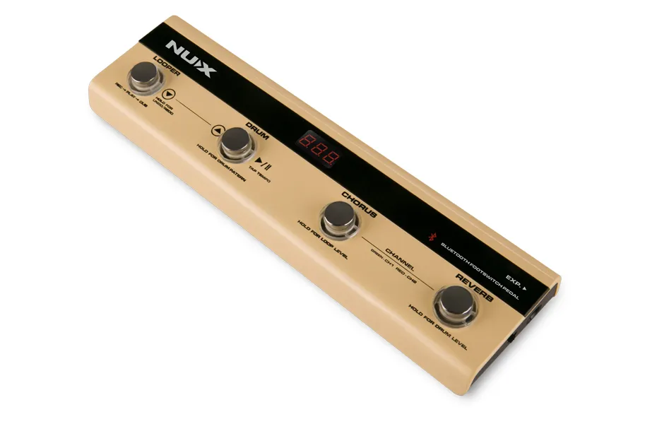 NUX NMP-4 is a wireless controller designed for NUX STAGEMAN acoustic guitar amplifier, with it you can access to STAGEMAN's hidden features: loop & drum machine and use it as hands-free on/off switch for on-board Chorus and Reverb effects. Turn both devices on, pair them up, ready for gigging.