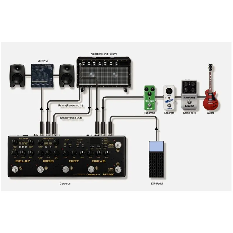 You can connect your all-time-favorite gear to Cerberus by placing it between analog and digital sections. You can use any combination of amps or pedals you desire.
