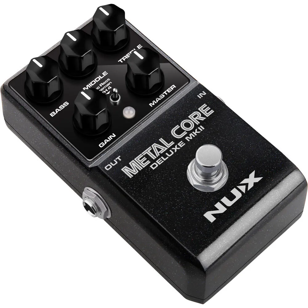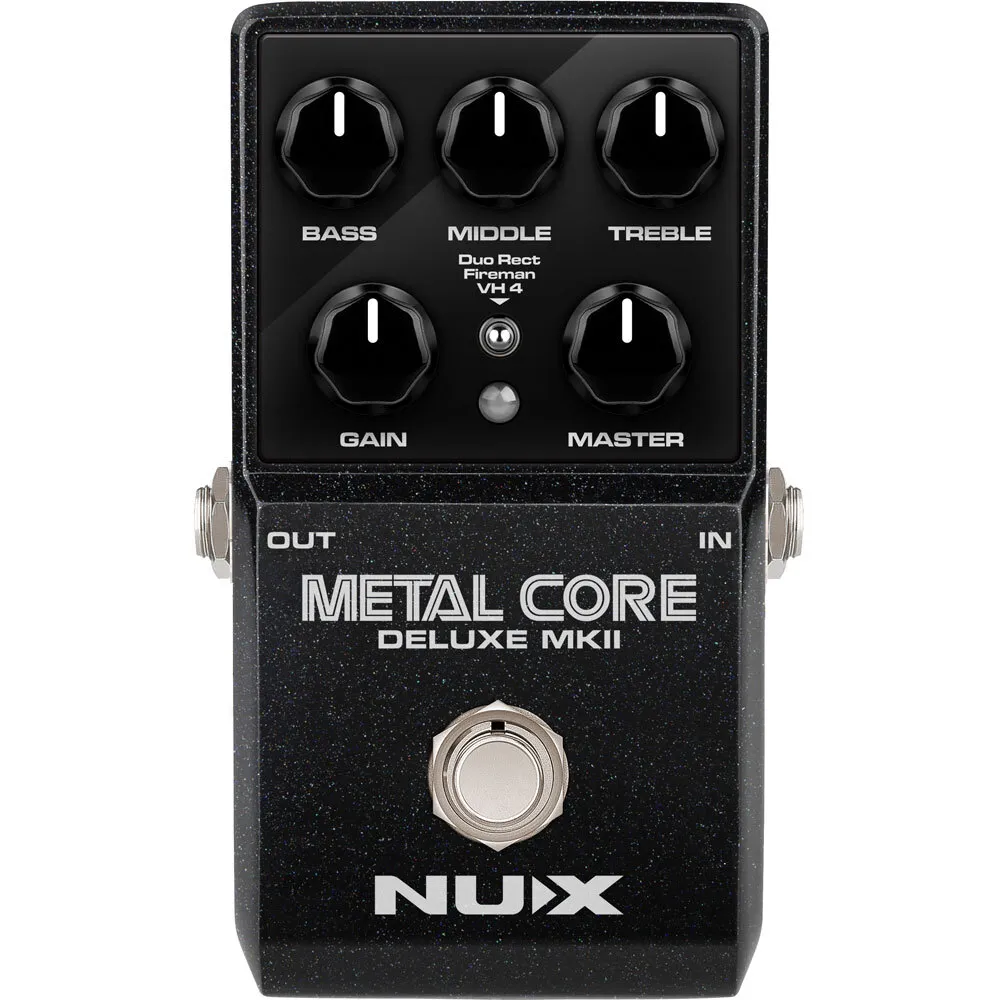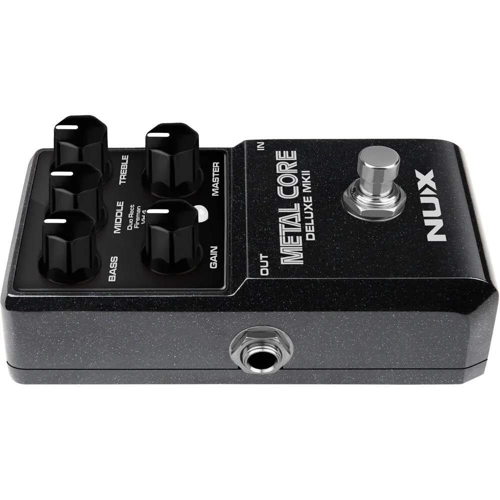 The NUX METAL CORE DELUXE MKII is a high gain preamp pedal with 3 distinctive high gain amp models including the Duo Rect, Fireman, and VH 4. You can select these models via the 3-way toggle switch.