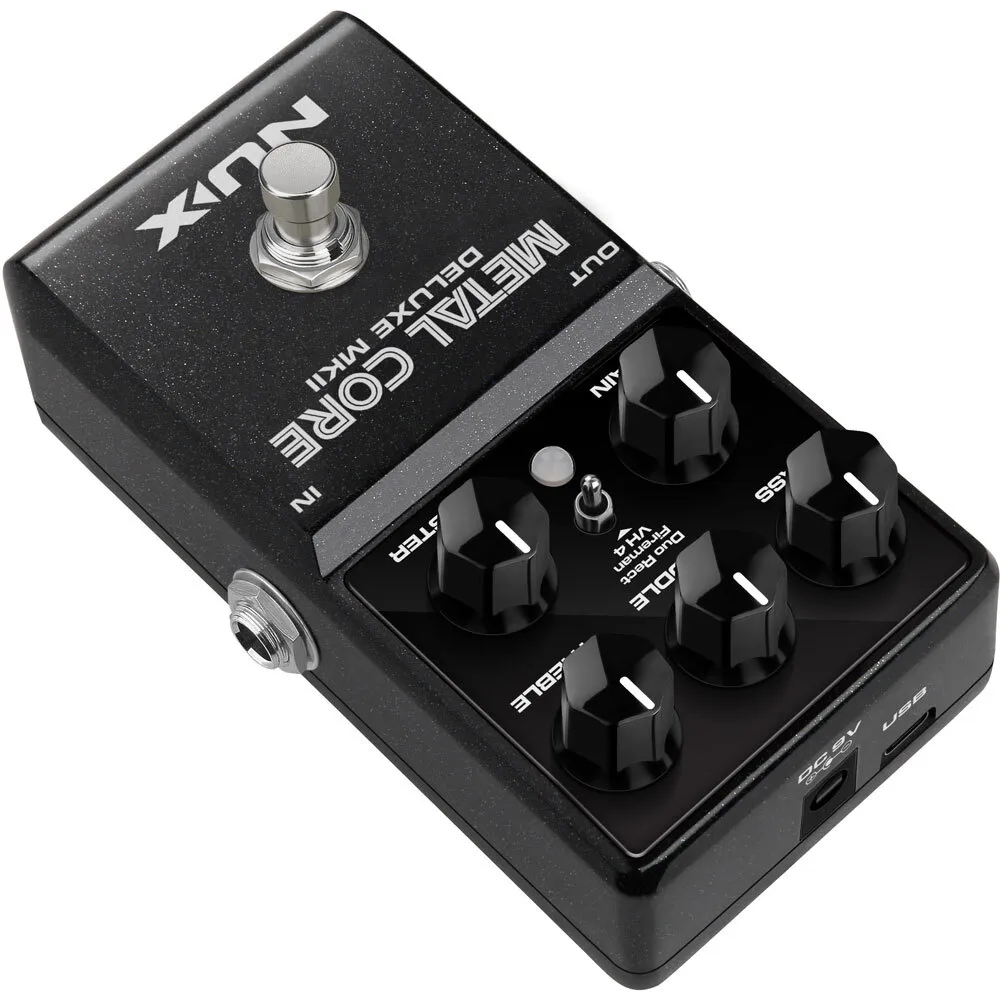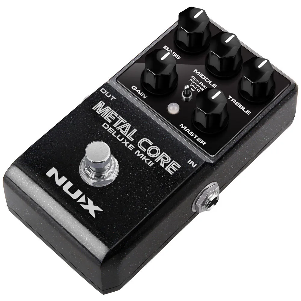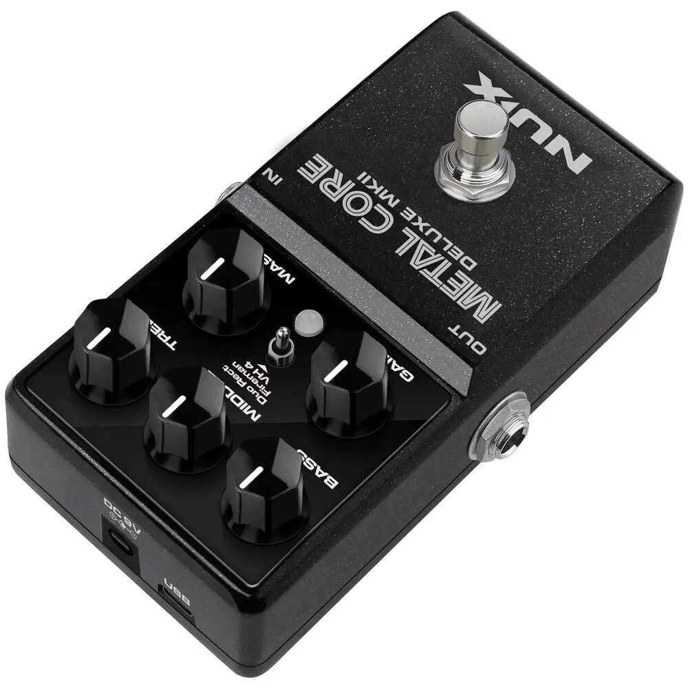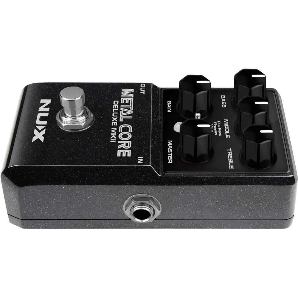 The NUX METAL CORE DELUXE MKII is a high gain preamp pedal with 3 distinctive high gain amp models including the Duo Rect, Fireman, and VH 4. You can select these models via the 3-way toggle switch.