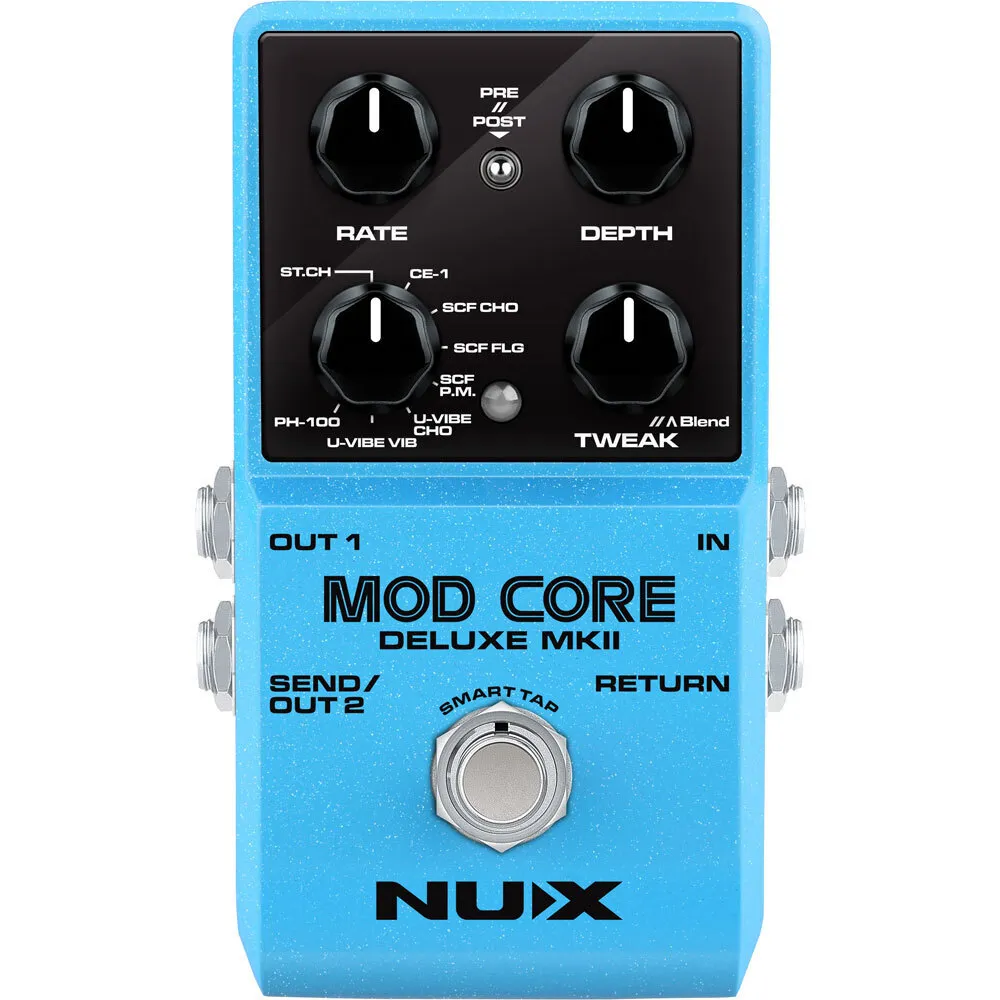 The NUX MOD CORE DELUXE MKII is a modulation pedal with 8 different types including ST.CH (Stereo Chorus), CE-1, SCF CHO, SCF FLG, SCF P.M., U-VIBE CHO, U-VIBE VIB and PH-100. You can switch the mod types by way of the Type rotary switch.
