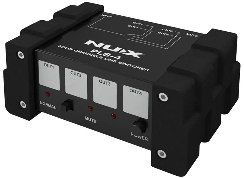 The NU-X PLS-4 is a four-channel Line Switcher. You can use an extensional footswitch pedal to select one of the four channels. For example, plug the guitar to the INPUT, send the sound to 4 different amplifiers, and select one of the amplifiers. Or, input 4 audio devices to PLS-4 and select one of them to output.