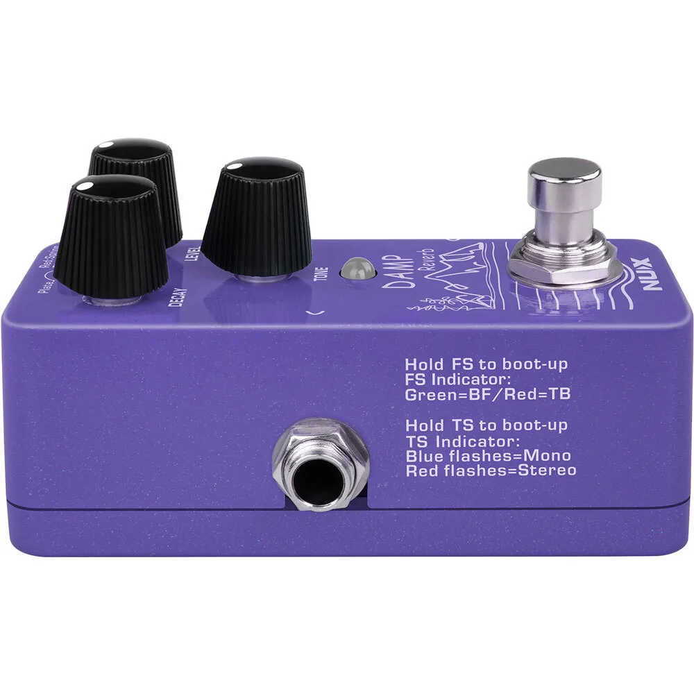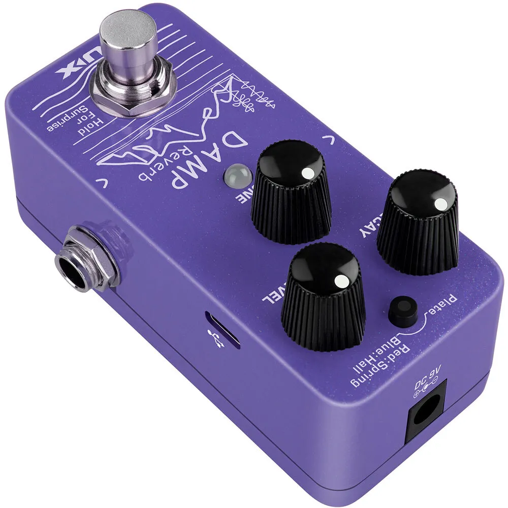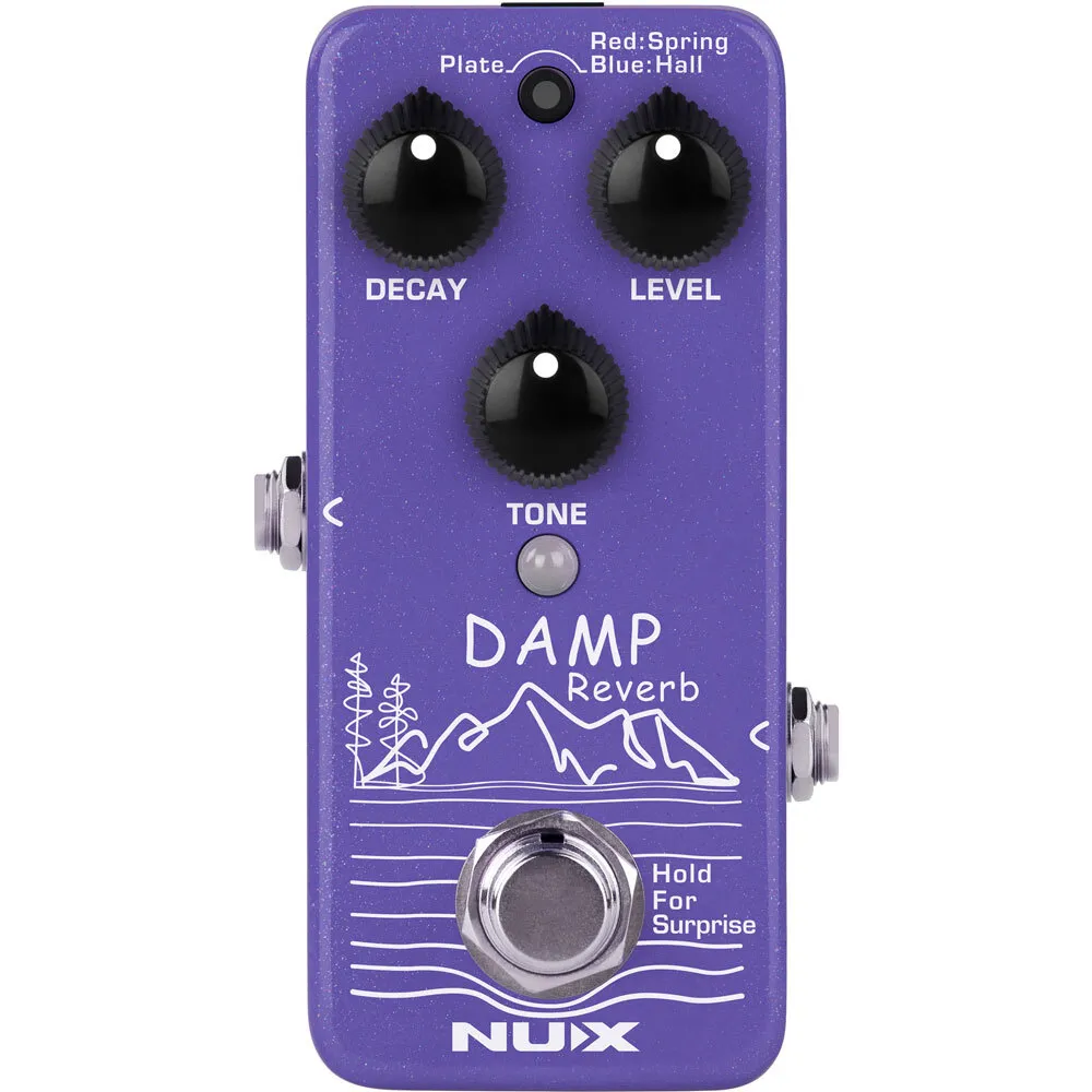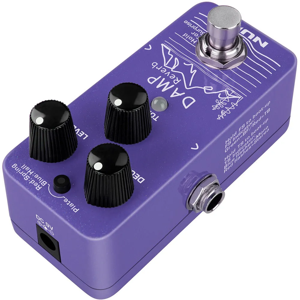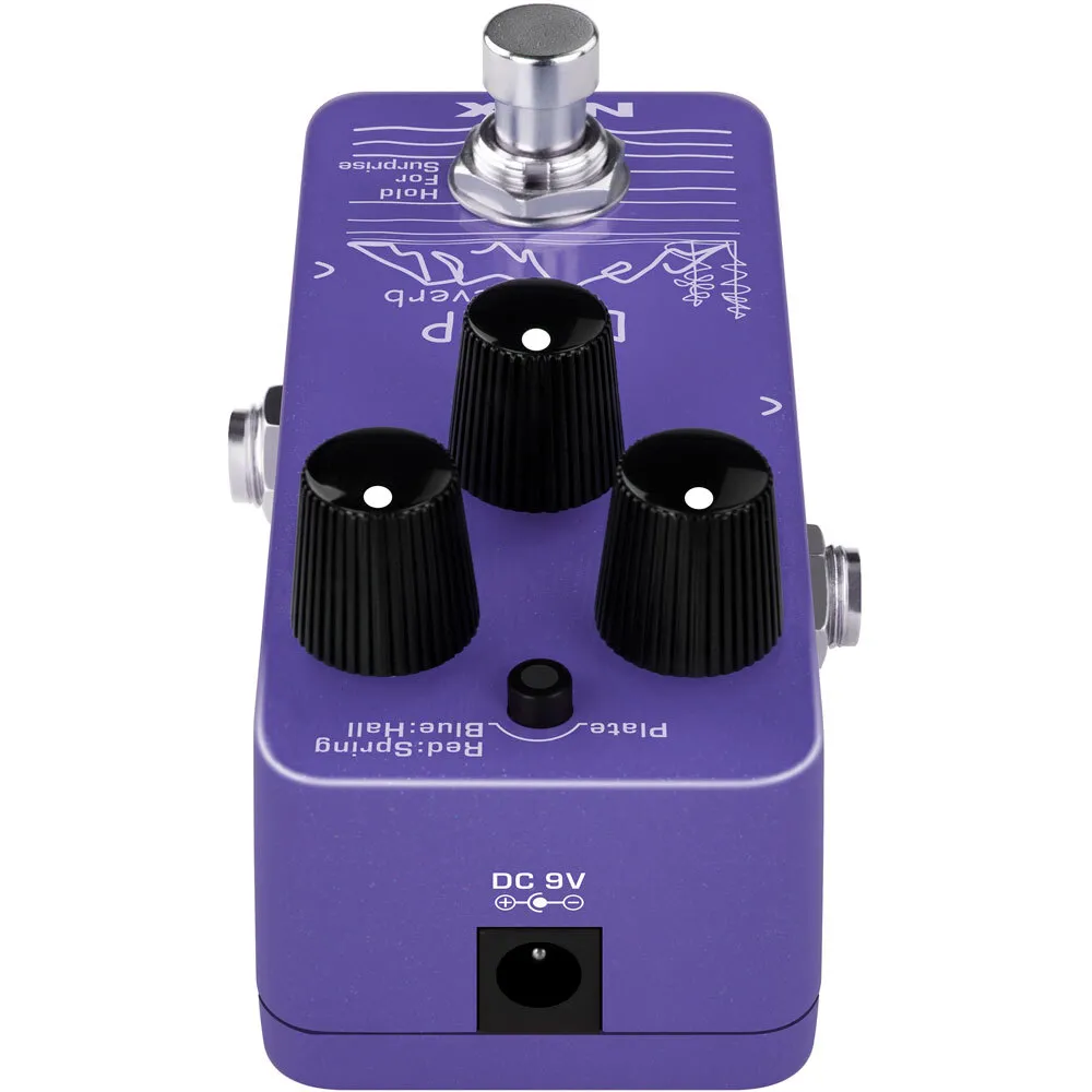 DAMP Reverb (NRV-3) is a mini reverb pedal with 3 different reverb types including Plate, Spring, and Hall. You can switch the types by tapping the tap switch.