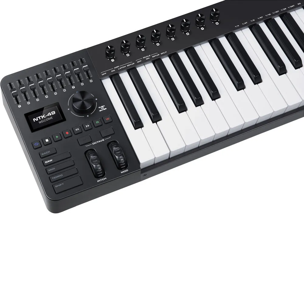 Advanced Features for Creative Control Equipped with a weighted keyboard and aftertouch, the NTK-49 adapts to various virtual instruments, allowing you to trigger different effects with precision. Its integrated faders and knobs provide real-time control over multiple MIDI CC parameters, enabling you to save custom presets and quickly edit template projects. Whether you're composing, recording, or performing, the NTK-49 offers all the tools you need to bring your music to life. Innovative Design for Inspired Music Production with a modern design that prioritizes ease of use, the NTK-49 not only facilitates project navigation and performance but also inspires creativity. The built-in arpeggiator and scale functions help you create intricate melodies, unique rhythms, and dynamic chord progressions. This MIDI controller is designed to spark new ideas and take your music production to the next level.