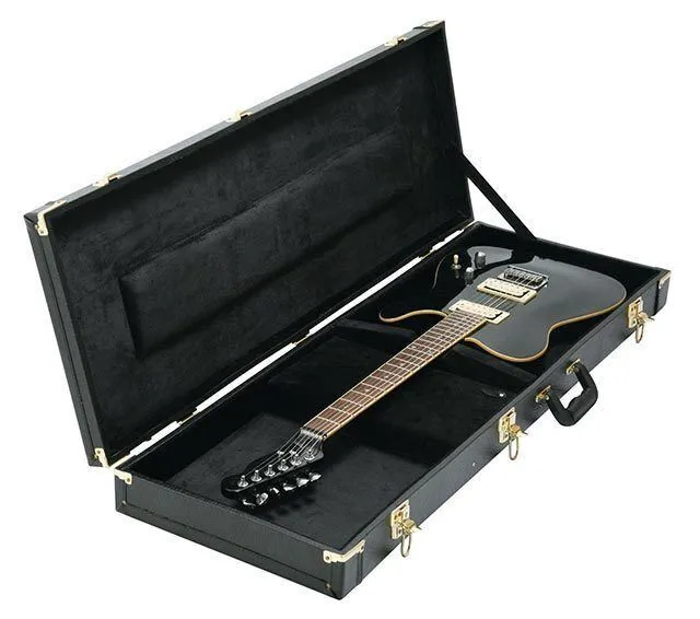 This hard shell electric guitar case is constructed from quality materials, perfect for protecting and transporting your guitar. It features a soft plush interior lining, solid chrome hardware (latches, hinges and feet), reinforced piping on all edges, and black vinyl exterior.