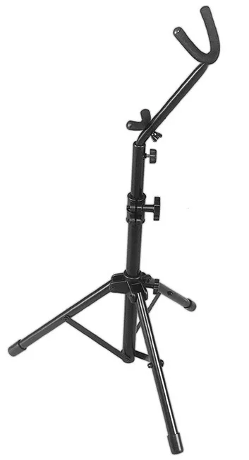 Designed for use when standing, this extra tall stand holds an alto or tenor saxophone at a height that can be easily reached without having to bend over.