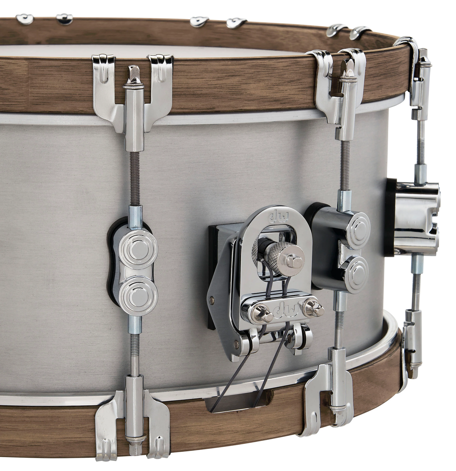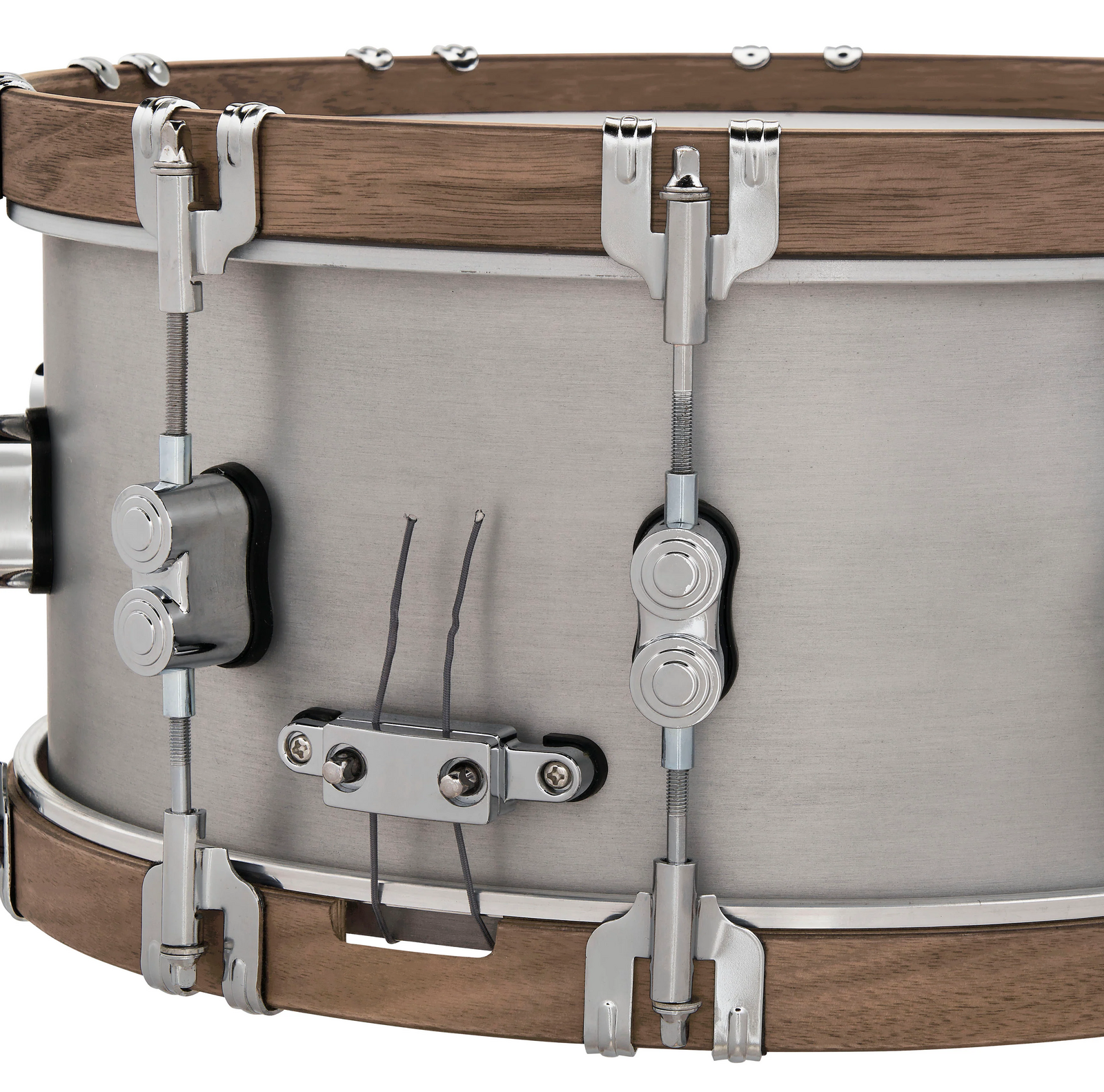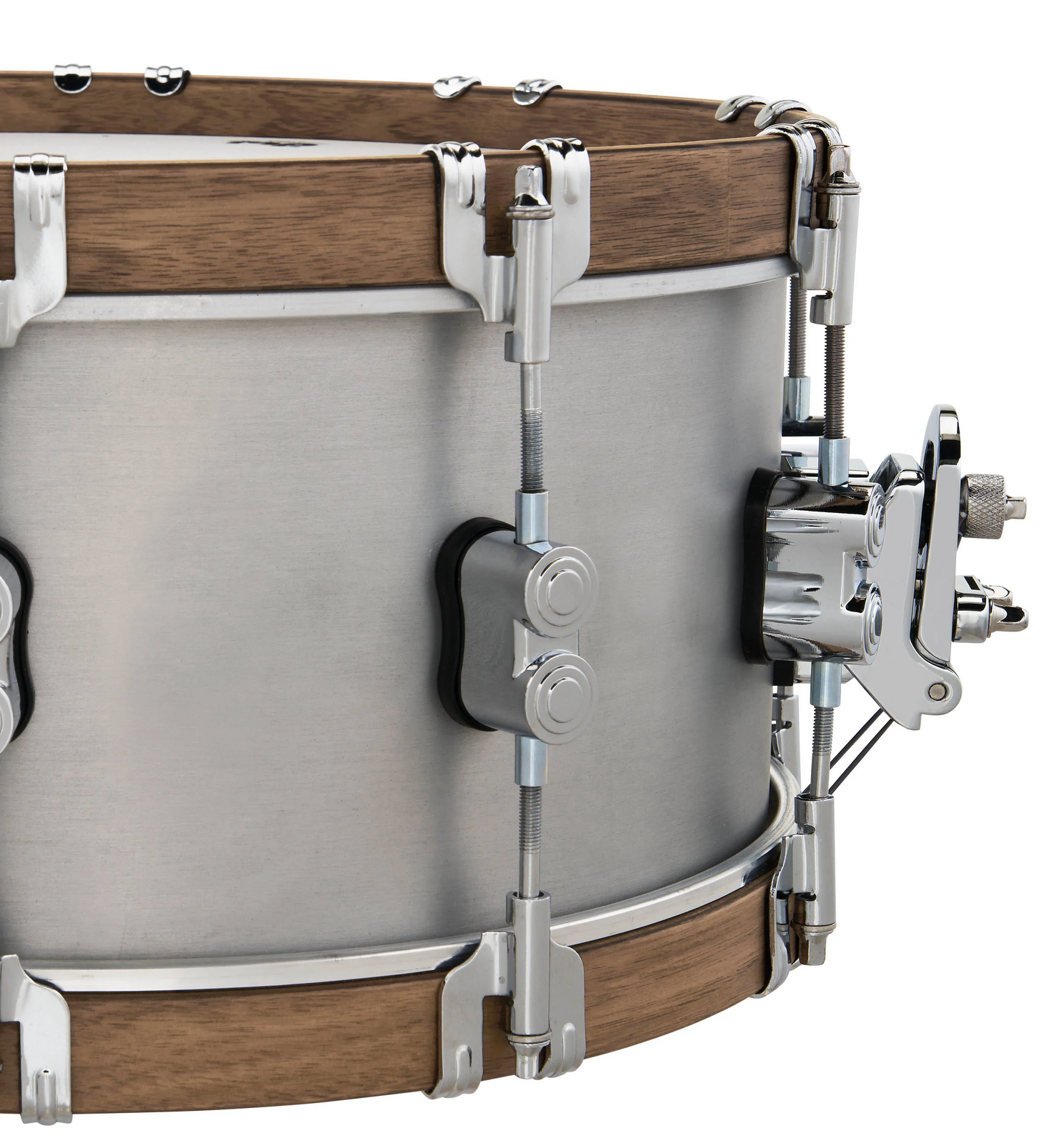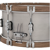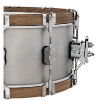 A stylish snare drum with a stout brushed 3mm shell and Walnut wood counter hoops.
