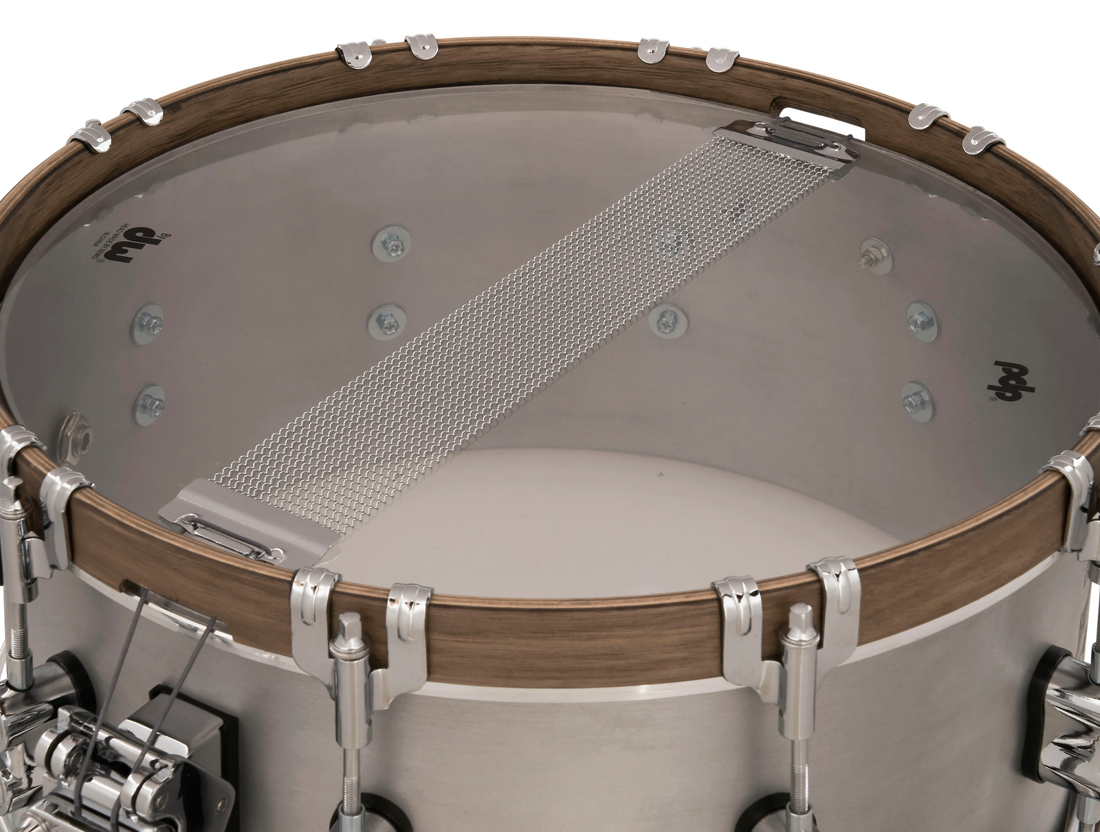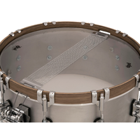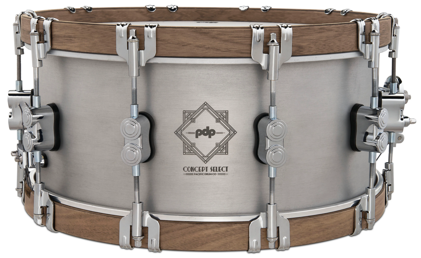 PDP's marquee line of Concept Select snare drums offers world-class tone and vintage looks paired with art deco-style laser-engraved logos. This snare features a thicker 3mm shell for a higher pitch with projection and volume balanced by Walnut hoops for subtle warmth with the classic dry sustain of Aluminum. The chrome hardware features stylish dual-turret lugs and high-end DW appointments like a MAG Throw-off' and True-Pitch Tuning' rods for easy snare engagement and precise tuning. The drums are also equipped with Remo heads so they're ready to play right out of the box. *