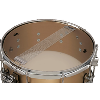PDP's marquee line of Concept Select snare drums offers world-class tone and vintage looks paired with art deco-style laser-engraved logos. This snare drum features a stout brushed bell bronze 3mm for higher pitch with cutting, thick attack and bright tone. The chrome hardware features stylish dual-turret lugs and high-end DW appointments like a MAG Throw-off' and True-Pitch Tuning' rods for easy snare engagement and precise tuning. Triple flange hoops offer long-term tone and durability for rim shots and side sticking. This drum is also equipped with Remo heads so it's ready to play right out of the box. *