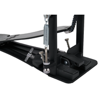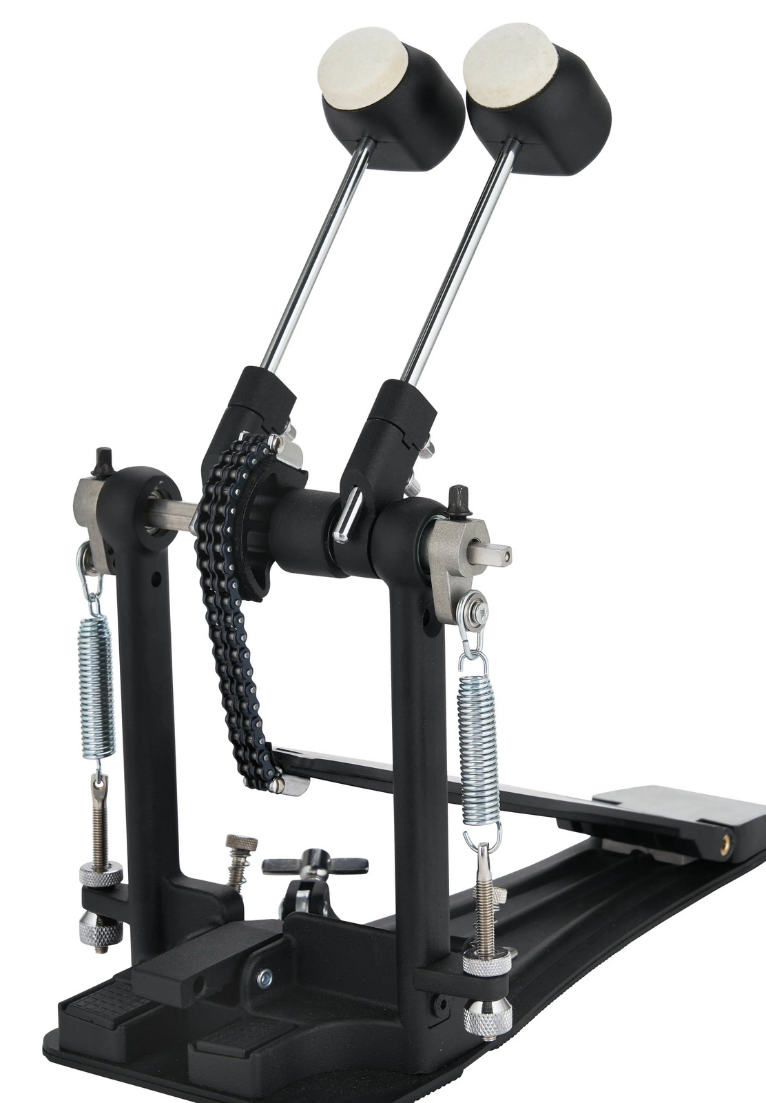 The Pacific Drum Company presents this heavyweight double pedal that's both stylish and responsive. Designed in California, the dual-post primary pedal is outfitted with a dual chain, concentric drive system, smooth cast footboard with integrated needle-bearing hinge, offset toe clamp, and telescoping linkage with universal joints. *