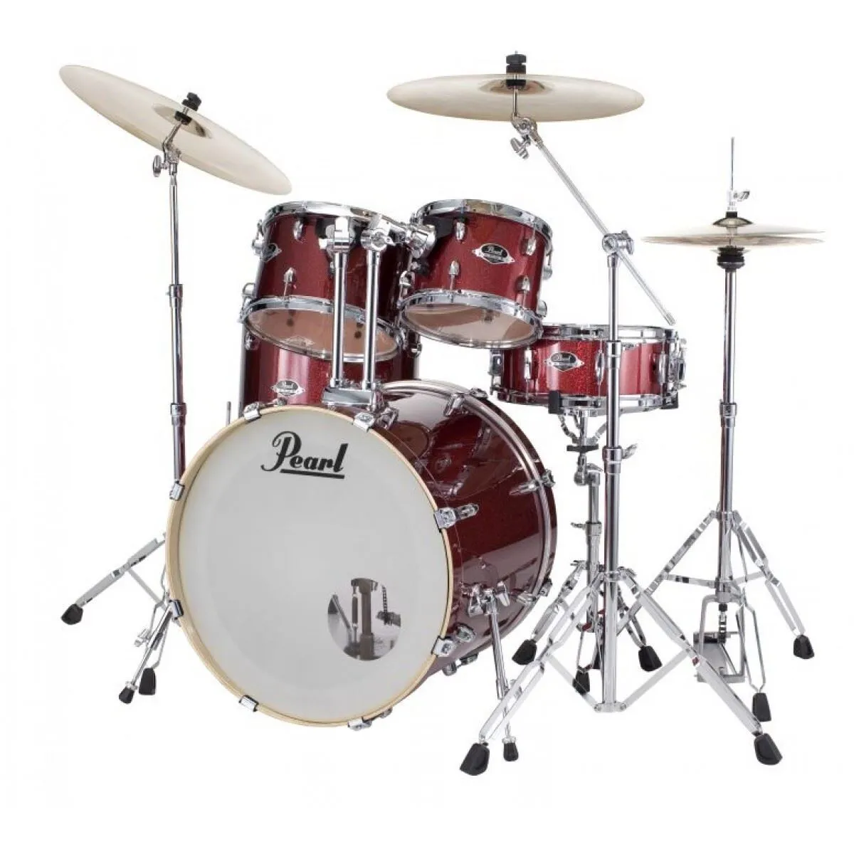 PEARL welcomes back the biggest selling name in drums. The Export has returned and includes a full overhaul of new features. The new Export Series offers a sonically advanced recipe of strategically arranged plies of premium popular and mahogany wood to maximize frequency response of every component. As with all Pearl drums, each shell is formed from our legendary SST construction process that uses extreme heat, Precision-cut scarf joints, our proprietary Acoustiglue and over 1000lbs of hydraulic pressure to create the ultimate acoustic air chamber. Pearl's new Opti-Lock mounting system, new Pearl 830 series hardware including the cool new Demonator pedal with long board. Cymbals not included. This is a 5 piece set up (10-12-16-14sn-22) in Black Cherry Glitter