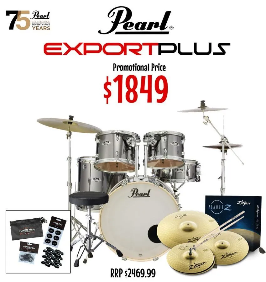 Pearl Export Plus 20" Fusion Pack - 5 Piece Kit Stool Zildjian Planet Z Cymbal Pack + Tuner Fish Essentials Pack & Sticks - Smokey Chrome
