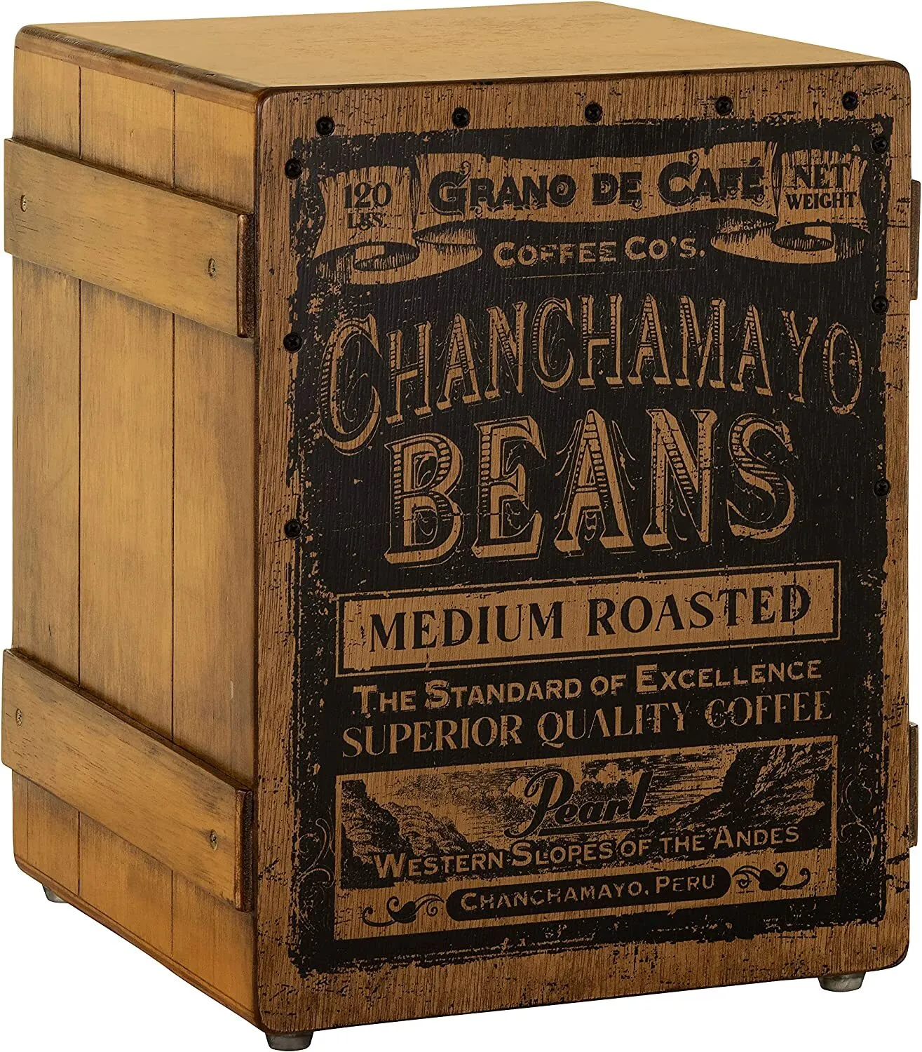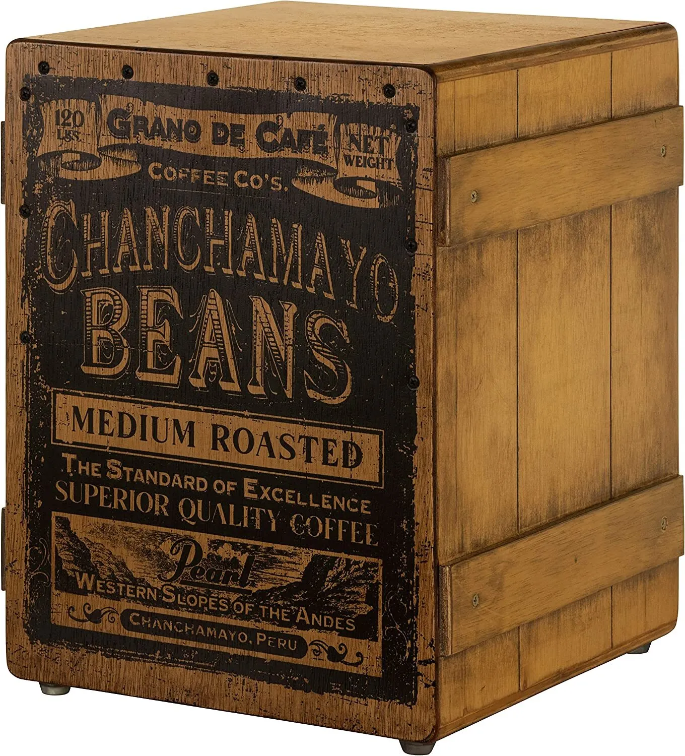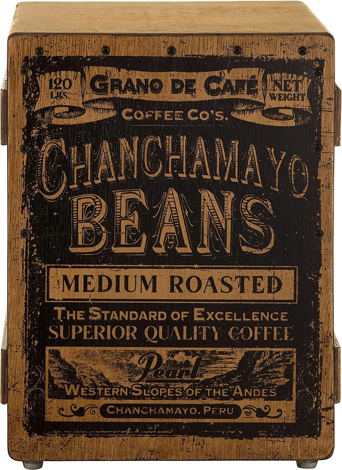 The body of the PBC320 Primero Coffee Bean Cajon is constructed using Shorea plywood and has a crate design that features a meranti faceplate with a coffee bean design.