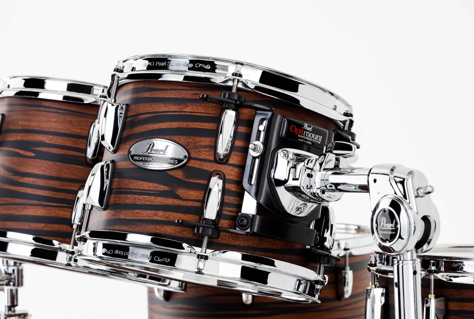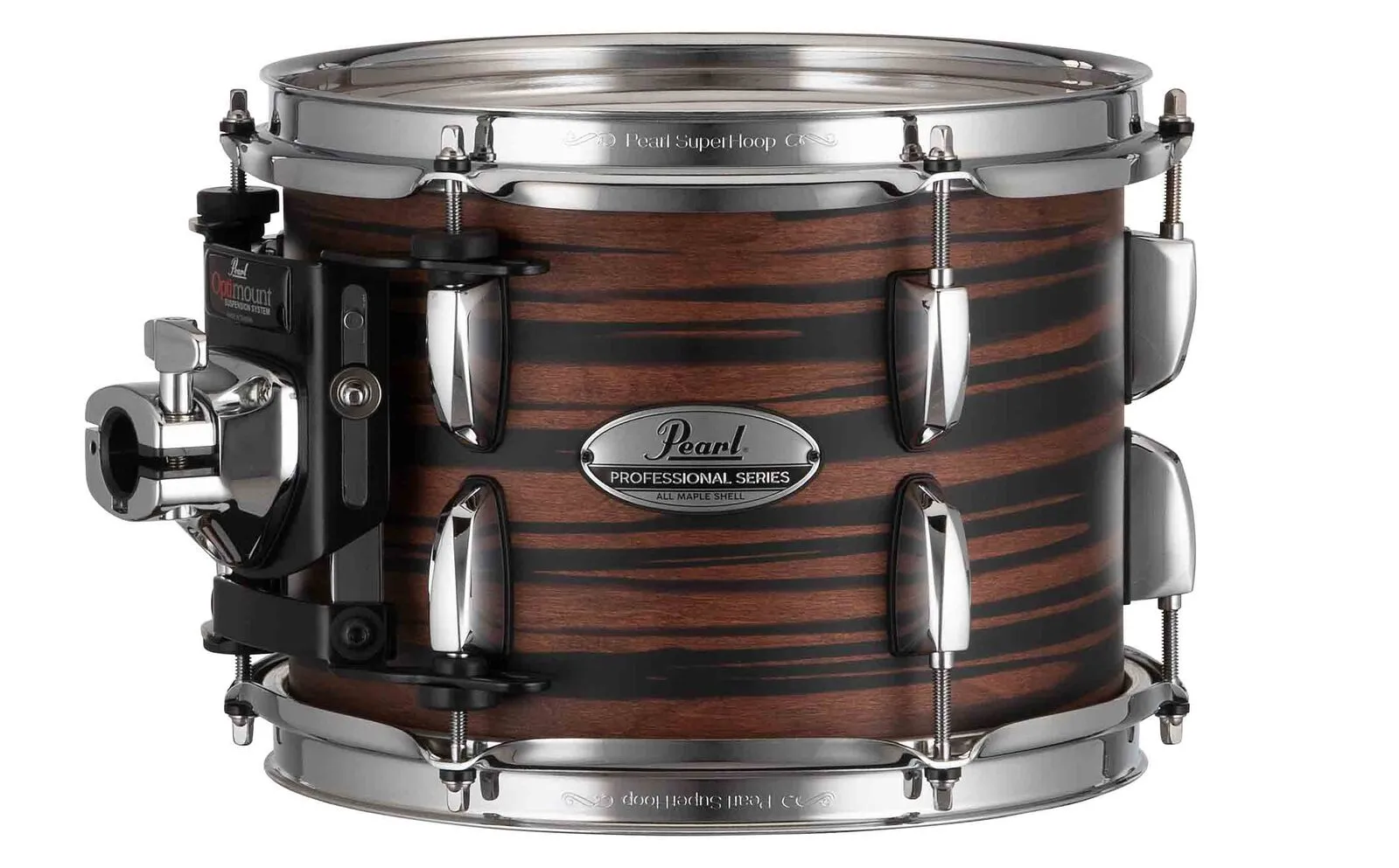 Professional Maple's total sound is enhanced by strong hardware elements and is designed to hold tuning under heavy play without inhibiting shell resonance. To pull the best voice from each Maple shell in the kit, all drums feature hardware elements selected for their tone enhancing properties. These include the SP30 bass drum spur with spring-loaded retractable spike, bridge-style RL Lug and LB40 Floor Tom Bracket for low shell contact, OptiMount four-point tom suspension mounts, R40 Air Suspension Floor Tom Feet, Die-Cast Bass Drum Claws, and Superhoop II Triple-Flanged Hoops. Each of these hardware pieces lends not only to the tuning and function of each drum but also to the overall sound of the total Professional Maple drum kit.