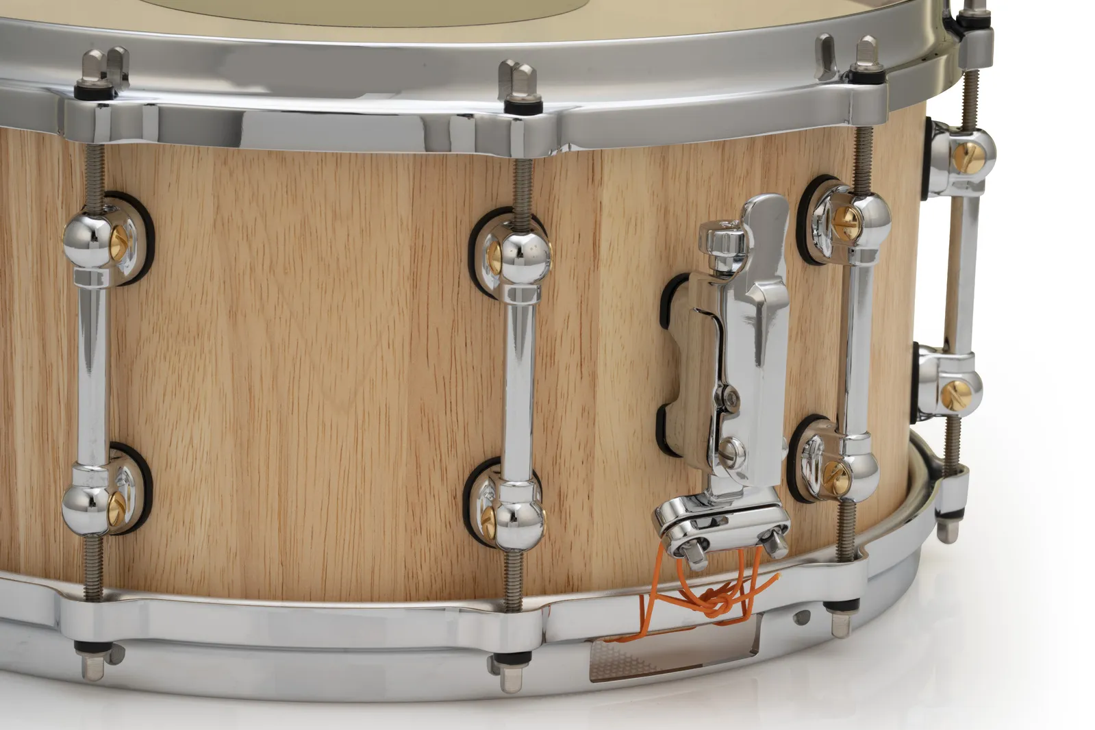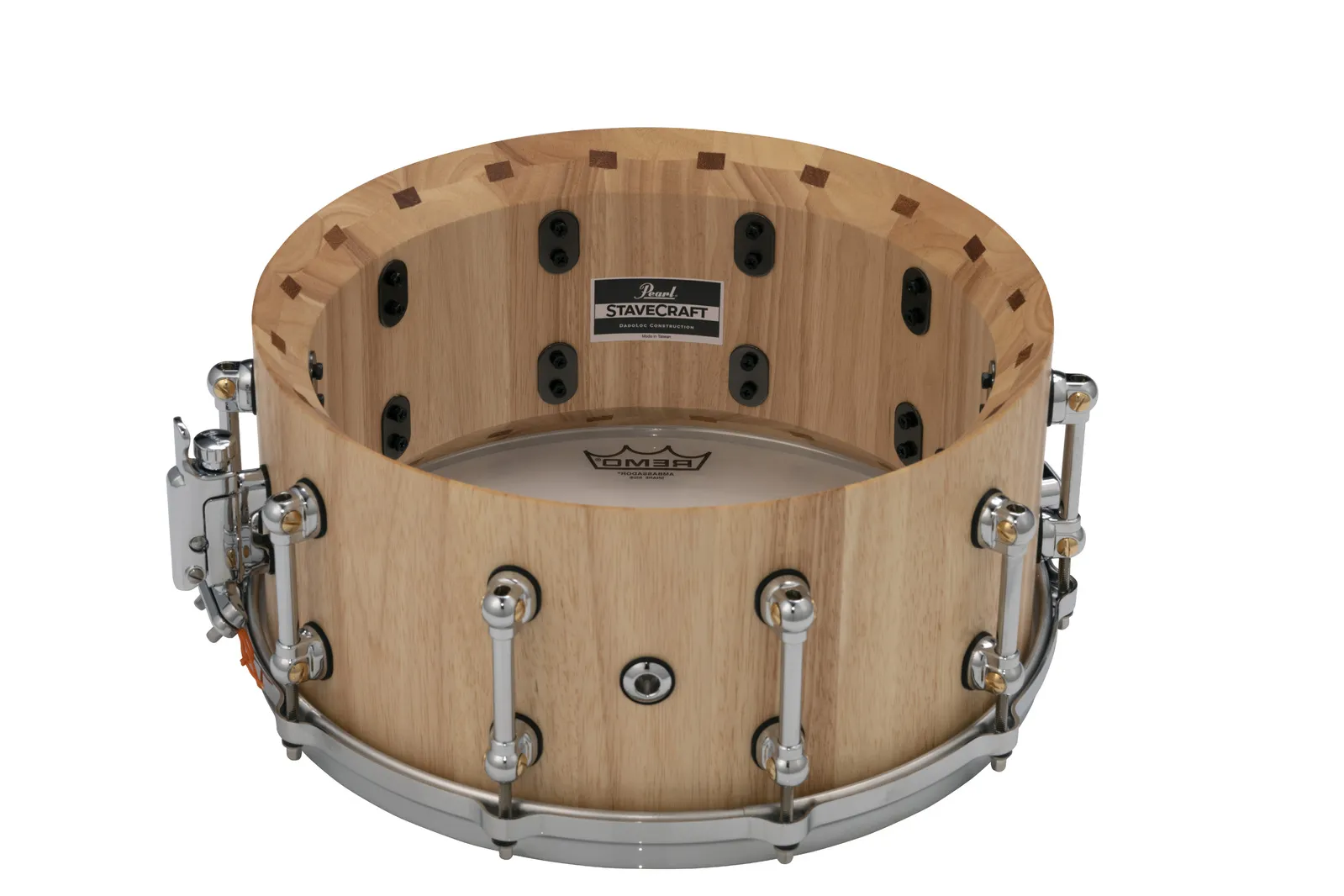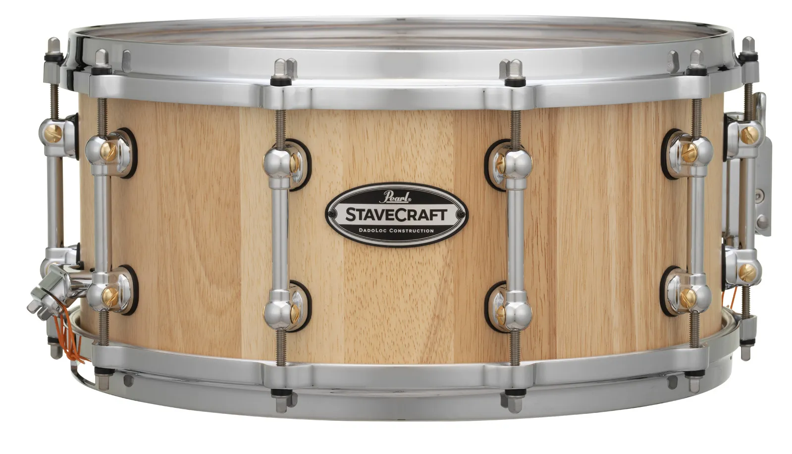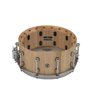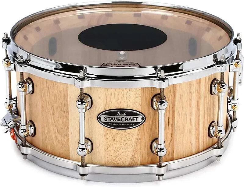 Yielding solid shell tonal snare spike from a bright mix of hardwoods, Pearl's StaveCraft snare drums are the perfect fusion of old-world workmanship and new-school performance. Each 25mm thick shell starts from two layers of meticulously beveled solid Thai Oak staves. Using a principal exclusive to Pearl, an added stave of exotic Makha wood is inserted into the center Dado channel formed by each stave. Like pieces in an intricate puzzle, this "Dado-Loc" joint increases total shell strength by 50%. The shell is then lathed to a perfectly round 25mm thickness, hand finished, and fitted with our Swivel Tube Lugs and MasterCast die-cast counter hoops for added volume and tuning precision. Producing sharp sonic focus and piercing volume for the heavy player, StaveCraft snares are a startling addition to any pro player's drumming soundscape.