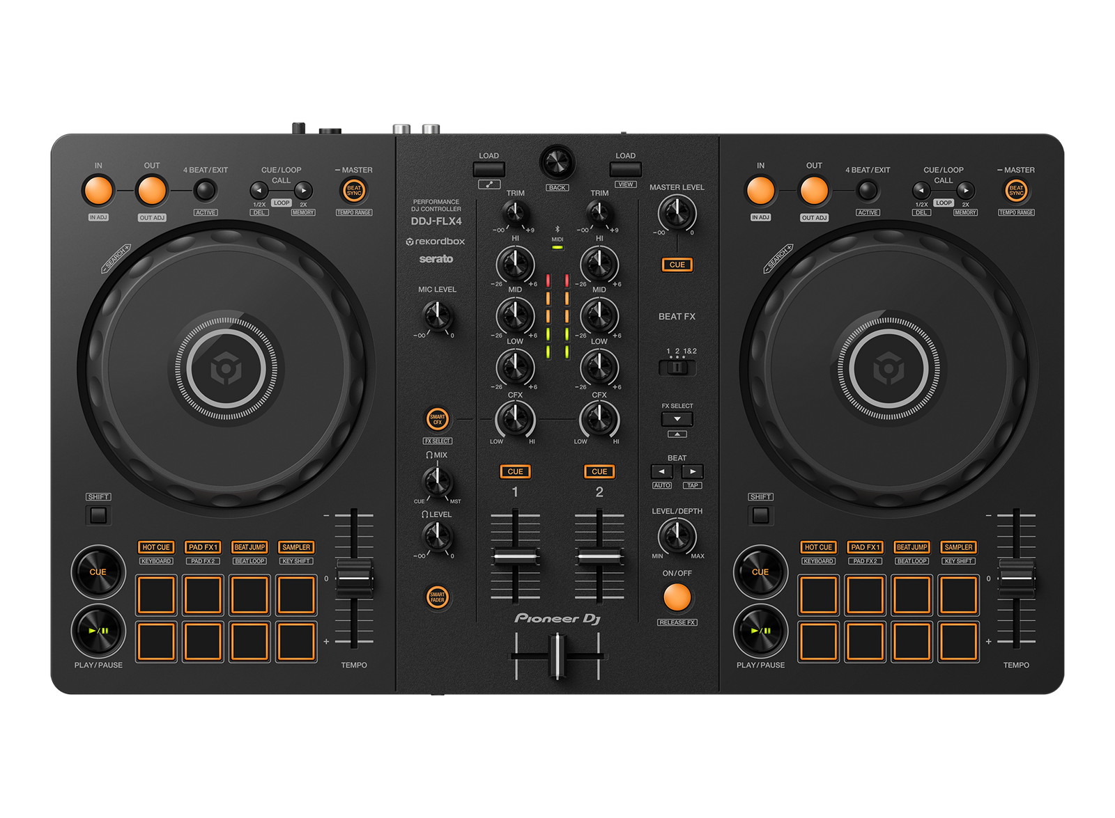 The layout of the controls on the DDJ-FLX4 makes it easy to learn to DJ and is inherited from professional Pioneer DJ products. Everything is simple to use and neatly arranged, which also makes the controller compact enough to take anywhere you want to practice or perform.
