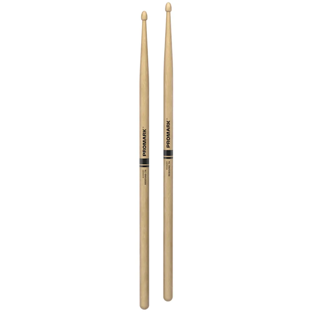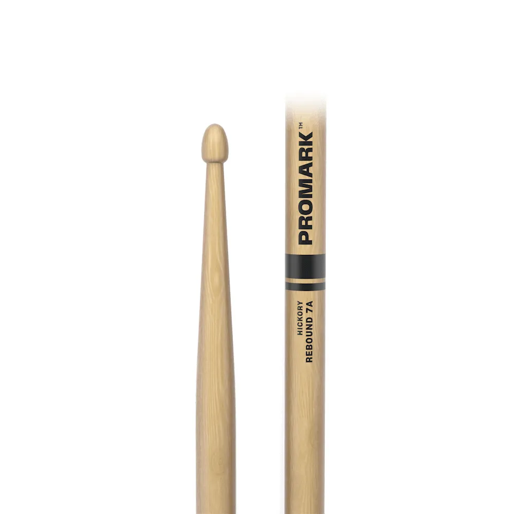 The ProMark Rebound 7A drumstick features an acorn tip shape and a long taper, producing a rear-weighted feel that is ideal for agility.