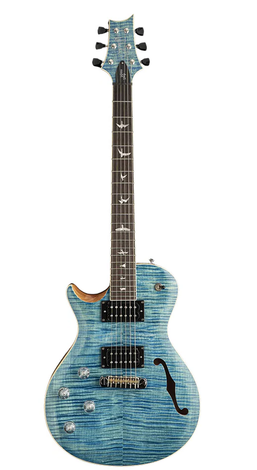The SE Zach Myers features a chambered mahogany body with maple cap, flame maple veneer and single f-hole that provides smooth mid-range tones with a natural, resonant internal reverb. The 22-fret 24.5” scale length wide fat neck boasts a satin finish that gives the guitar a very comfortable, woody, worn-in feel. Additional appointments to the SE Zach Myers signature model include PRS adjustable stoptail bridge, vintage style tuners, and PRS SE 245 pickups paired with two volume and two tone controls and a 3-way toggle pickup switch.