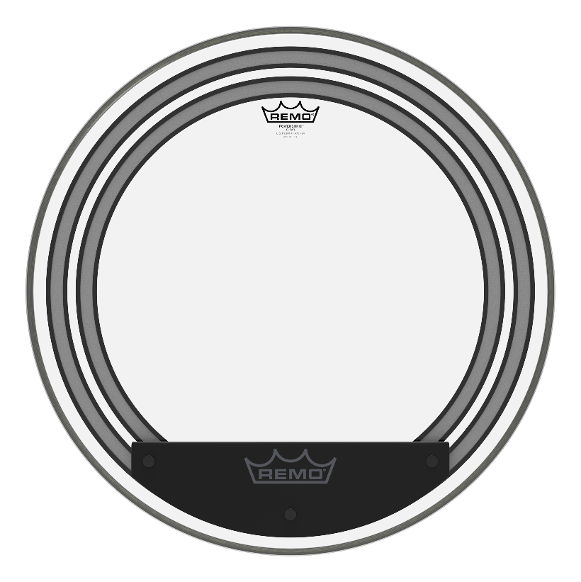 Constructed with 2-plies of 7-mil and 5-mil Clear film, Powersonic® Clear bass drumheads provide two specifically placed subsonic dampening rings and external snap on dampening system with impact patch for more attack.
