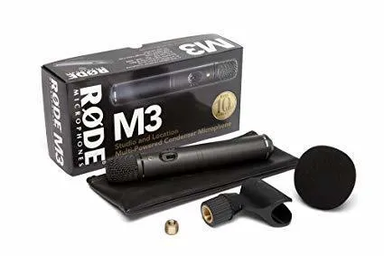Studio and location multi-powered cardioid condenser microphone with switchable HPF and PAD. The RØDE M3 is a highly versatile condenser microphone powered by 9V battery or phantom power.Featuring a heavy duty metal body and internally shock mounted 1/2" condenser capsule mounted for end-address, the M3 is at home in the studio, on stage or on location and is equally suitable as a vocal microphone, guitar microphone, drum microphone or presenter microphone.A -10dB and -20dB level attenuation (or PAD), selectable from inside the battery compartment, allows recording of loud sound sources, such as a guitar amplifier or drum. A high-pass filter selectable on the microphone power switch introduces a filter at 80Hz to reduce low frequency sounds and handling noise.The RØDE M3 versatile multi-powered microphone is covered by RØDE Microphones' industry leading 10 year warranty.