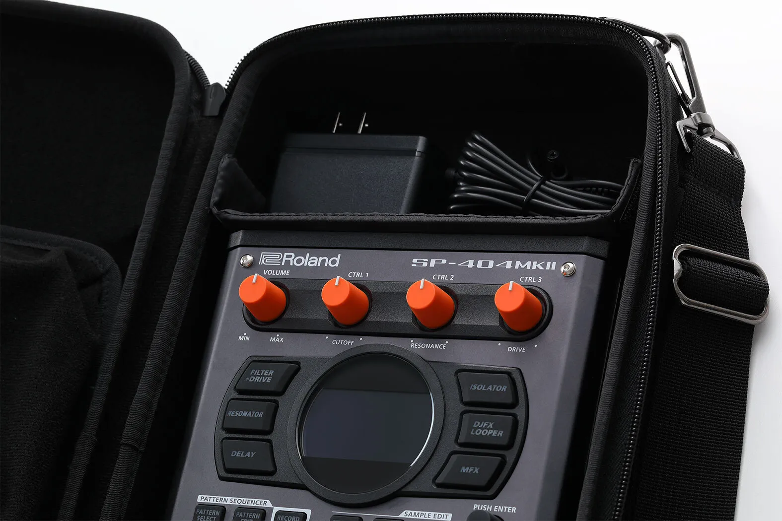 The CB-404 is the official carrying case for the Roland SP-404MKII and previous models in the iconic SP-404 portable sampler series. Streamlined and rugged, it features a semi-rigid EVA shell with a tough polyester exterior and a moveable internal partition that creates separate compartments for the sampler and items such as an AC adaptor. There’s also a detachable pouch for small items, plus a shoulder strap with a wide adjustment range. As a bonus, we’ve also included four orange knobs for customizing the look of the SP-404MKII model.