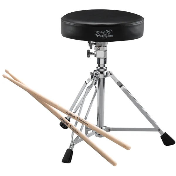 Start playing your new V-Drums set right away with this handy accessory package. It features a matched pair of high-quality hickory drumsticks with the V-Drums logo, plus a rugged, double-braced drum throne that will provide comfortable support through years of heavy drumming sessions.