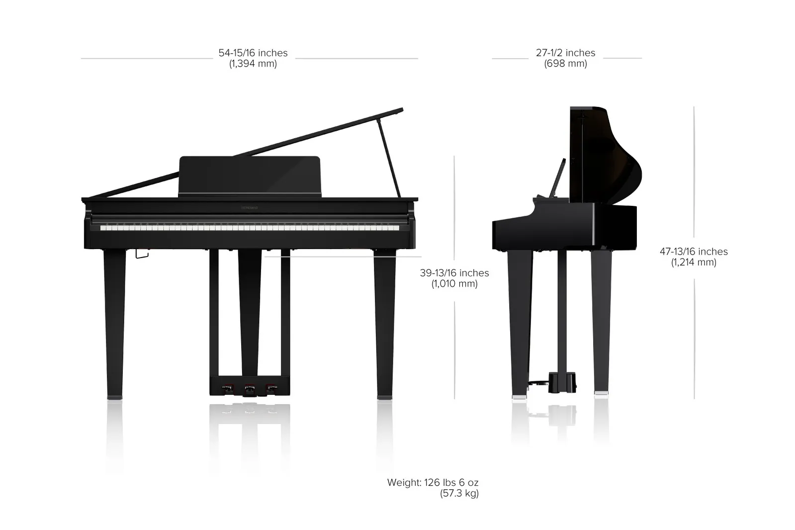 • Compact grand piano with a low-profile footprint and shallow depth (698 mm/27.5 in.) for tight living spaces