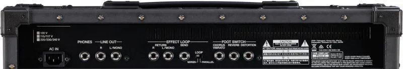 The JC-40’s rear panel is filled with connectivity options. There’s an effects loop for patching in mono or stereo effects, and you even have your choice of serial or parallel operation. Line Out jacks give you a convenient mono or stereo feed to a mixing board or recorder, while the headphones jack is great for quiet practicing with your setup late at night or on the road. There’s also support for optional footswitches, allowing you to easily turn the JC-40’s chorus/vibrato, reverb, and distortion effects on/off while performing.