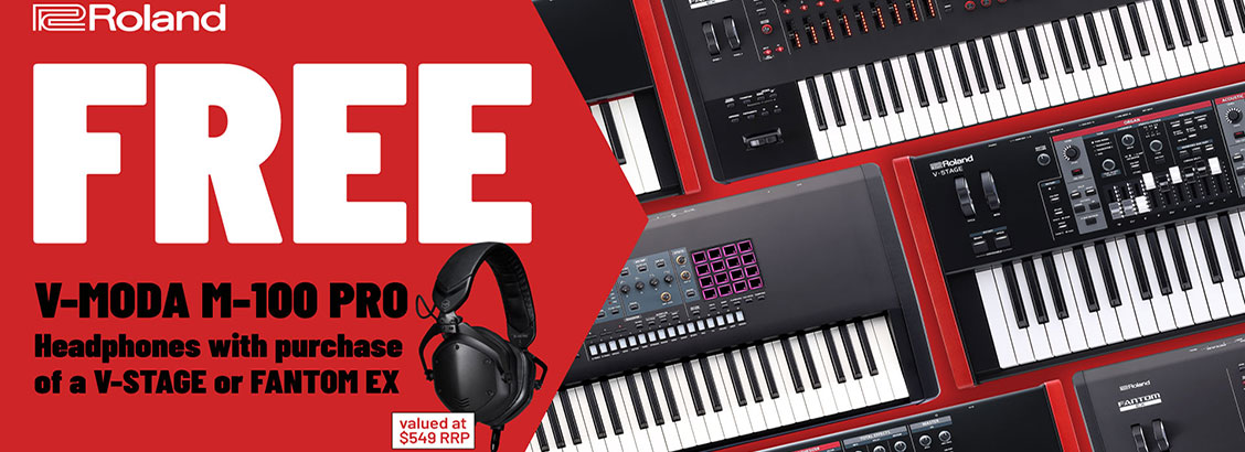 For a limited time, when you purchase a V-STAGE 88, V-STAGE 76, FANTOM 8 EX, FANTOM 7 EX, or FANTOM 6 EX, you are eligible to redeem a FREE pair of V-MODA M-100 PRO headphones, via redemption, valued at $549 RRP.