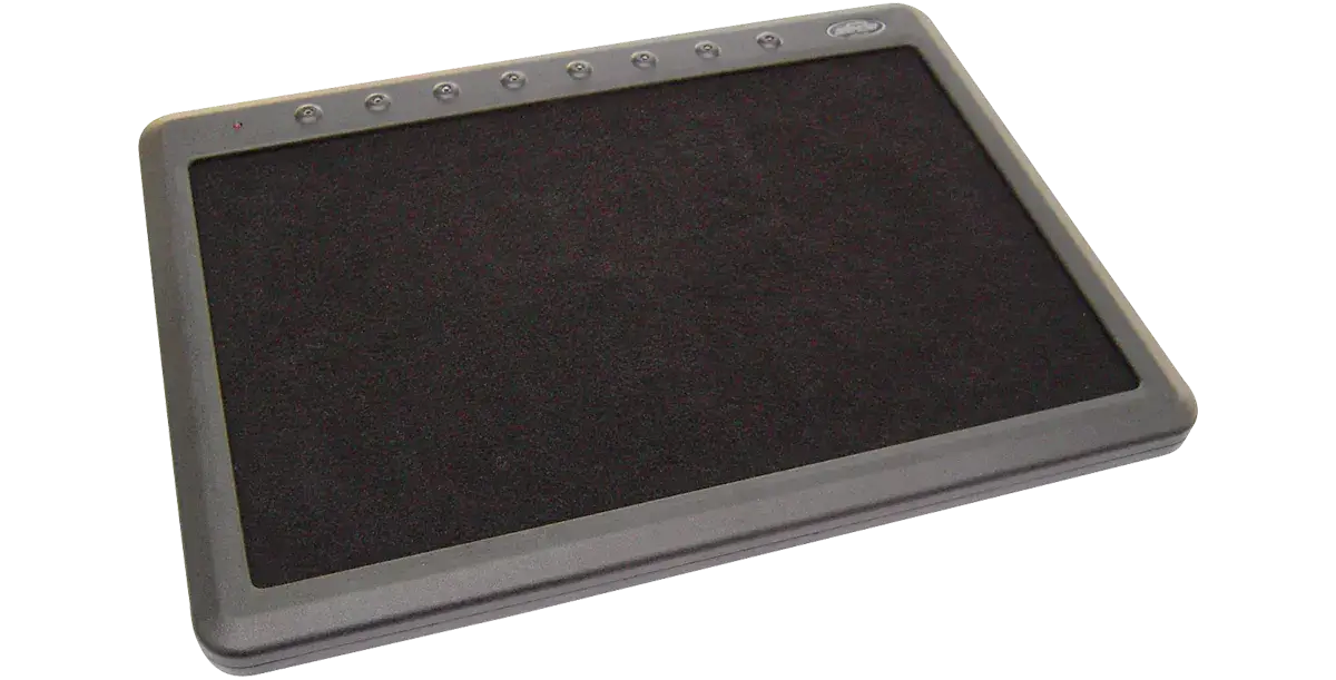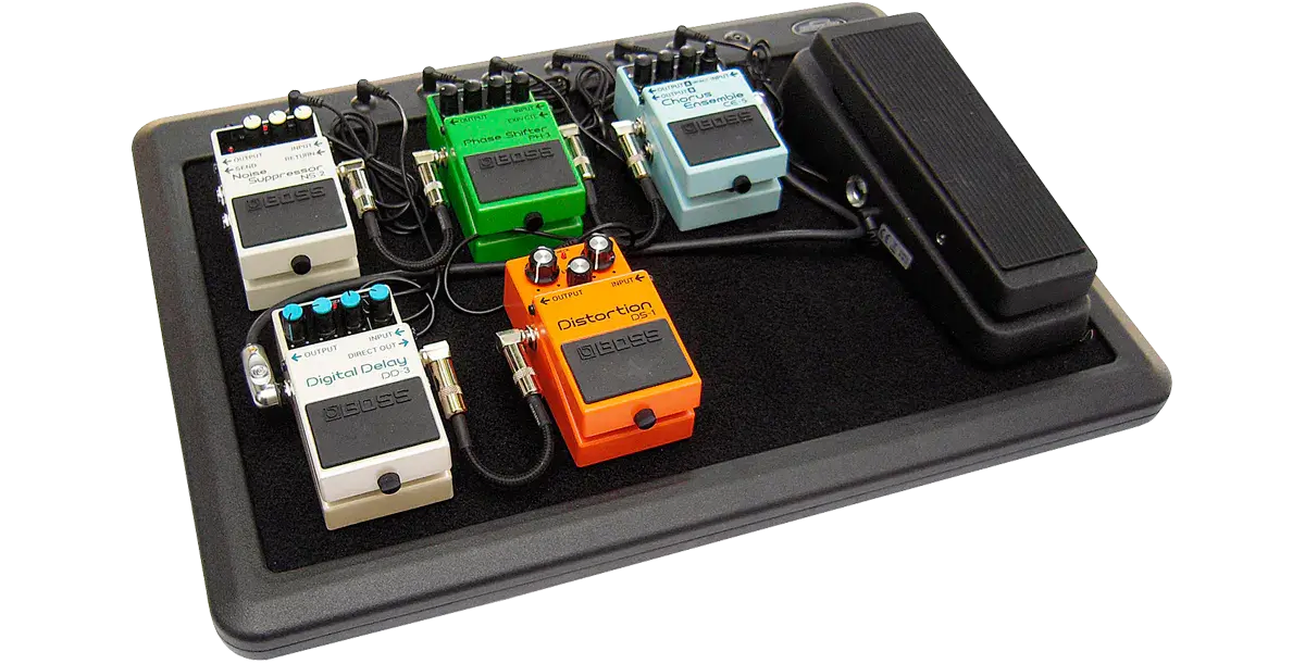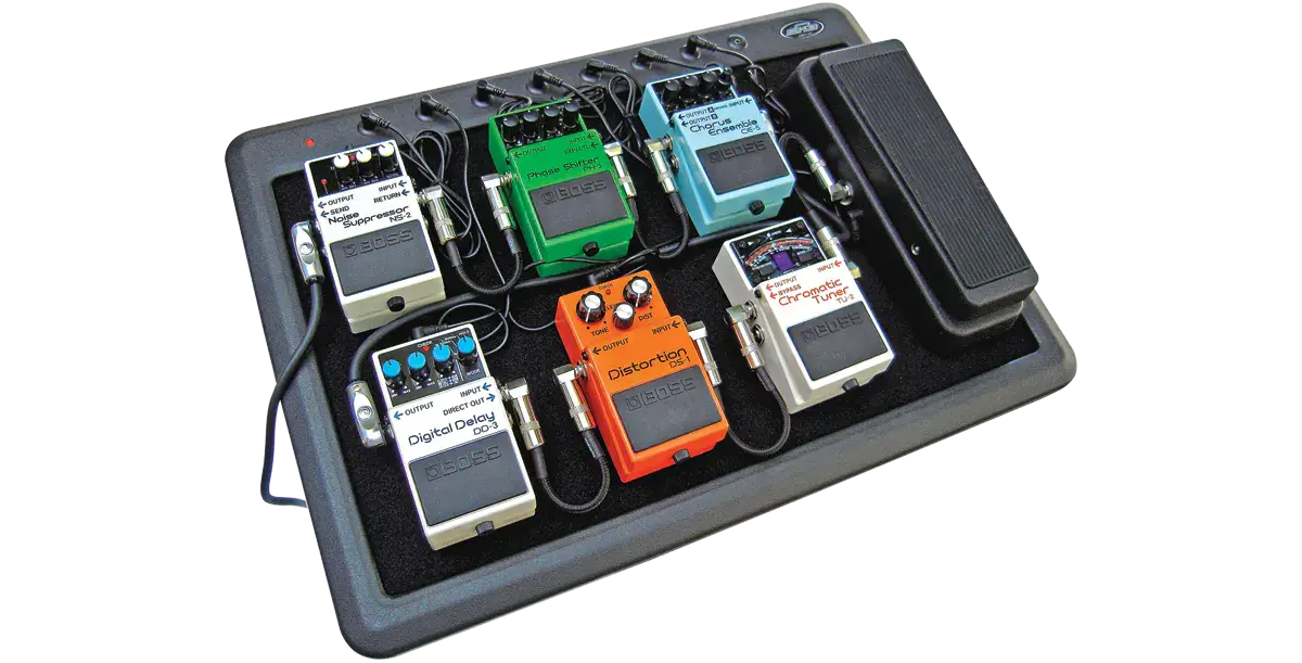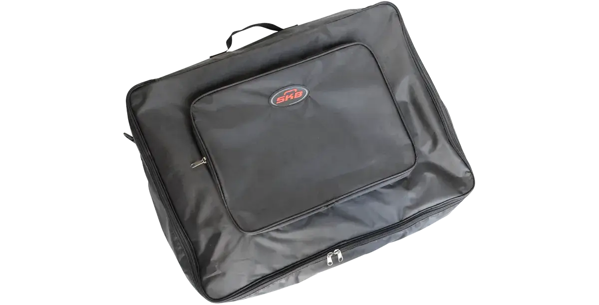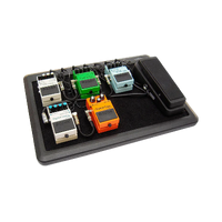 The 1SKB-PS-8 Powered Pedalboard is injection-molded from eco-friendly rubber modified styrene which provides for a very durable and rigid, yet lightweight platform for guitarist’s effect pedals. The 1SKB-PS-8 features eight (8) built-in 9VDC output jacks and an external transformer rated at 500mA of total current. The large 19” x 12” hook and loop surface allows for secure pedal positioning for up to eight (8) standard size pedals. All cables are included for powering the most popular pedals. A heavy-duty ballistic nylon carry bag with exterior zipper pocket and adjustable shoulder strap are also included with the 1SKB-PS-8 Powered Pedalboard