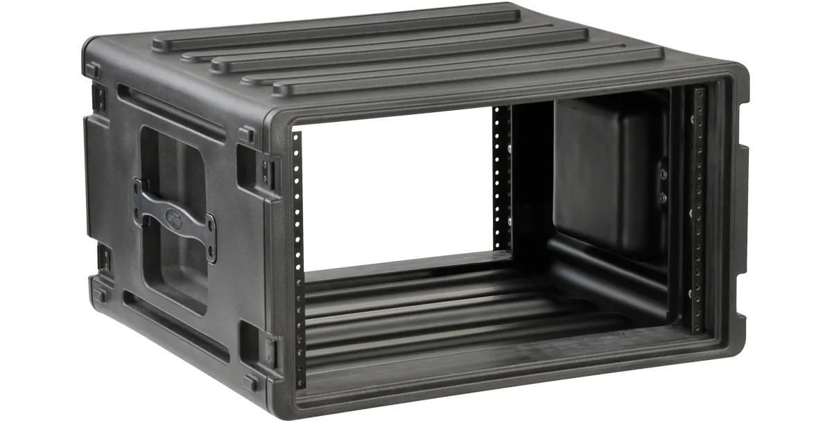 The exteriors feature SKB's recognizable bar design that signifies the rack unit size on the front and rear lids. Molded bars on top and bottom also provide interlocking capabilities allowing you to easily and securely stack them with SKB's Shallow Racks and Roto Rolling Racks, making transport even more convenient and secure. Lids include rubber gasket seals to keep water out. Other standard features include front and rear steel threaded rails and rack screws (10-32 thread), recessed steel Mil-Spec twist latches, flush carry handles, and non-slip rubber feet. All Standard Roto Racks are 17.6" deep from front rail to rear rail.