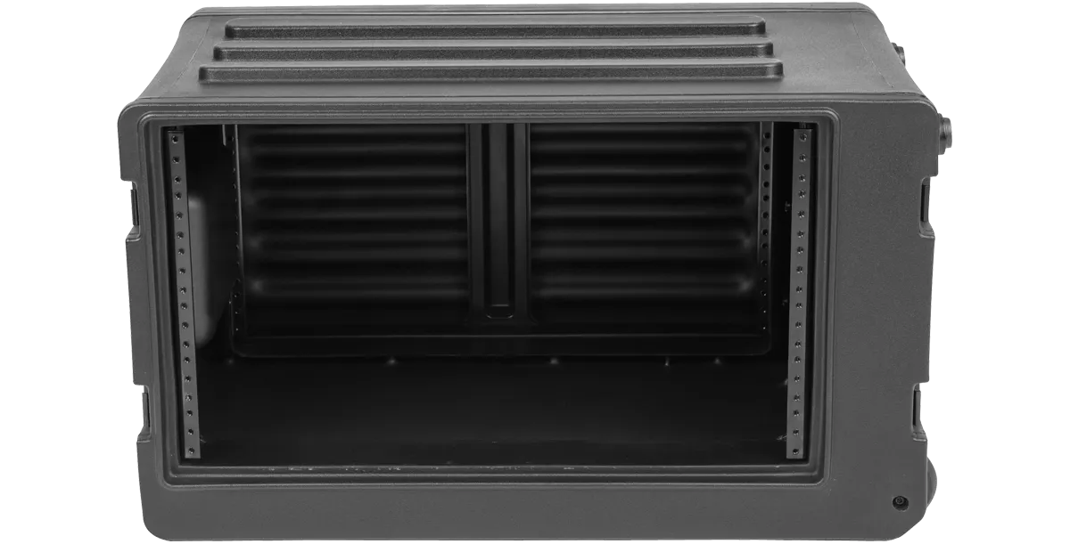 The exteriors feature SKB's recognizable bar design that signifies the rack unit size on the front and rear lids. Molded bars on top and bottom also provide interlocking capabilities allowing you to easily and securely stack them with SKB's Shallow Racks and Standard Roto Racks, making transport even more convenient and secure. Lids include rubber gasket seals to keep water out. Other standard features include front and rear steel threaded rails and rack screws (10-32 thread), recessed steel Mil-Spec twist latches, flush carry handles, and non-slip rubber feet. All Roto Rolling Racks are 17.6" deep from front rail to rear rail.
