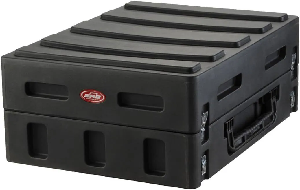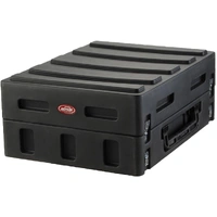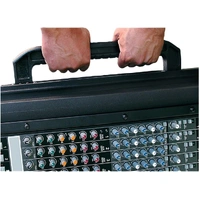 The GigSafe takes the top 14U+ rack spaces of the Mighty GigRig and puts it in an easier to handle case. The GigSafe includes two large side mounted handles that allow the load to be balanced when carrying. The lid is extended so XLR cables can remain plugged into the mixer. The GigSafe also includes four recessed latches that can be used to secure to the top of the 1SKB-REX6 Expander Rack to provide the same amount of mounting rack units as the Mighty GigRig. With the addition of the 1SKB-R3224 wheel dolly, the GigSafe and Expander can be maneuvered with ease.