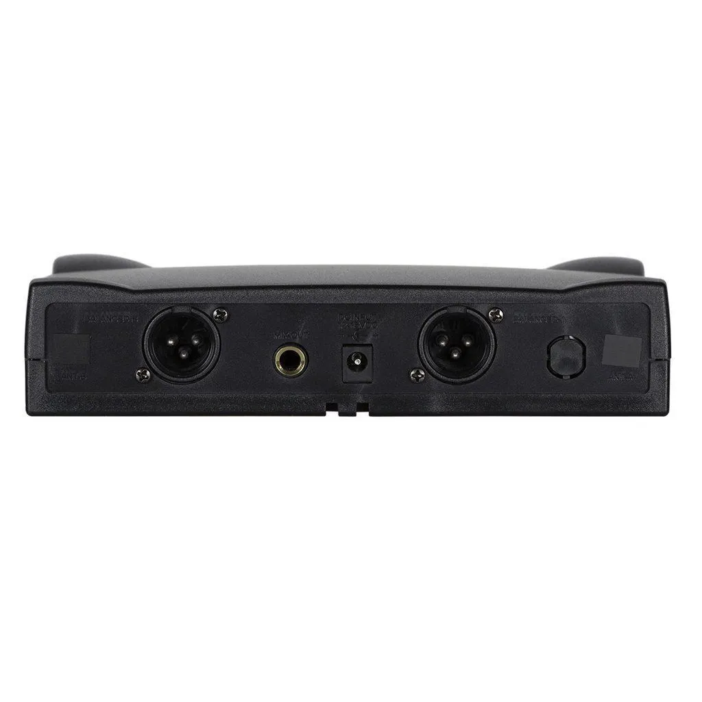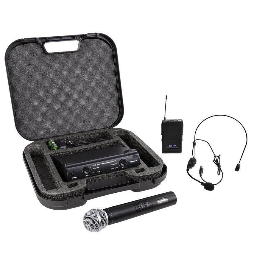 This model features a two channel receiver, which means that the included hand-held wireless microphone and headset mic can be used at the same time without interference from one another. The volume of each microphone can also be independently adjusted from the front panel of the receiver.