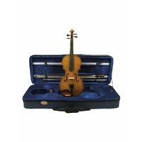 Solid spruce hand carved top. Solid maple back, neck and ribs. Indian rosewood fingerboard, pegs and tail piece. Four adjusters. Genuine purfling. German bridge and tail gut. Wood bow with natural hair. Complete with black rectangular case. Padded plush line interior with large inner accessory pockets and two bow holders. Antique chestnut