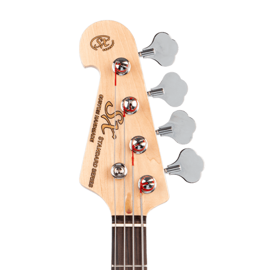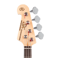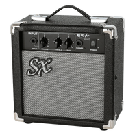 SX PB style bass. Solid basswood body. Select Canadian maple neck with 2 way truss rod. Rockwood fingerboard. 20 frets. 30” scale. P Pickups. Volume and tone controls. White 3 ply scratchplate. Vintage chrome machine heads and bridge. SX 10 watt amplifier with 5” speaker, volume, bass and treble controls. Headphone socket.