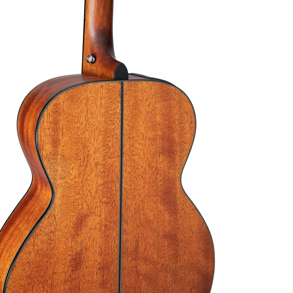 The okoume top combined with the okoume back and sides create a rustic, rootsy sound that delivers robust fundamental tones. The slim satin-finish mahogany neck and 12" radius jatoba fingerboard provide great feel and playability,