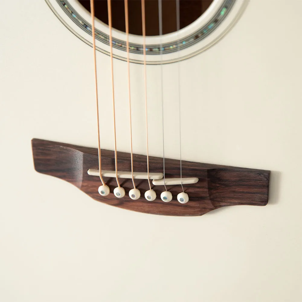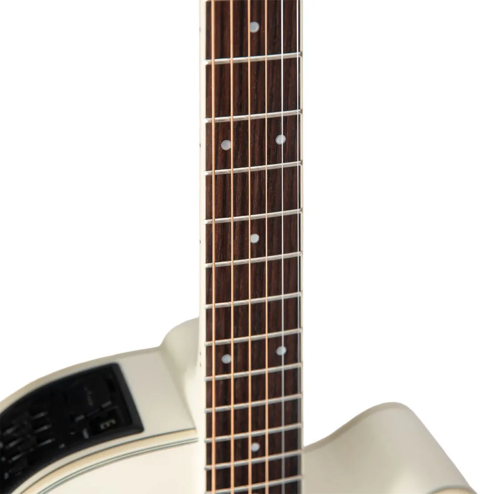 Finished in elegant gloss pearl white, this NEX guitar features ivoroid binding over the body, fingerboard, and headstock. Touched with gold hardware, pearl dot inlays, and a beautiful abalone rosette, this guitar exemplifies elegance and striking simplicity. The tonewoods create a very shimmering, punchy, bold sound that is great across a wide variety of musical styles that is 100% Takamine.