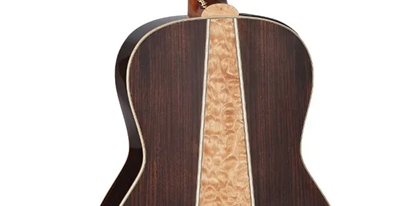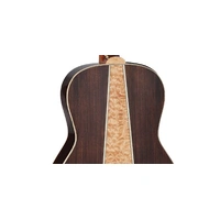 Other premium features include maple body, neck and headstock binding, dark wood rosette and body purfling, synthetic bone nut and split bridge saddle, laurel headcap, abalone dot inlays, gold diecast tuners with black buttons, and a beautiful gloss finish.